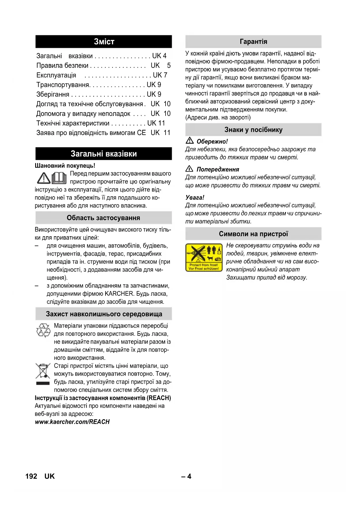 з допоміжним обладнанням та запчастинами, допущеними фірмою KARCHER. Будь ласка, слідуйте вказівкам до засобів для чищення. Матеріали упаковки піддаються переробці для повторного використання. Будь ласка, не викидайте пакувальні матеріали разом із домашнім сміттям, віддайте їх для повтор- ного використання. Старі пристрої містять цінні матеріали, що можуть використовуватися повторно. Тому, будь ласка, утилізуйте старі пристрої за до- помогою спеціальних систем збору сміття. Інструкції із застосування компонентів (REACH) Актуальні відомості про компоненти наведені на веб-вузлі за адресою: www.kaercher.com/REACH У кожній країні діють умови гарантії, наданої від- повідною фірмою-продавцем. Неполадки в роботі пристрою ми усуваємо безплатно протягом термі- ну дії гарантії, якщо вони викликані браком ма- теріалу чи помилками виготовлення. У випадку чинності гарантії звертіться до продавця чи в най- ближчий авторизований сервісний центр з доку- ментальним підтвердженням покупки. (Адреси див. на звороті)