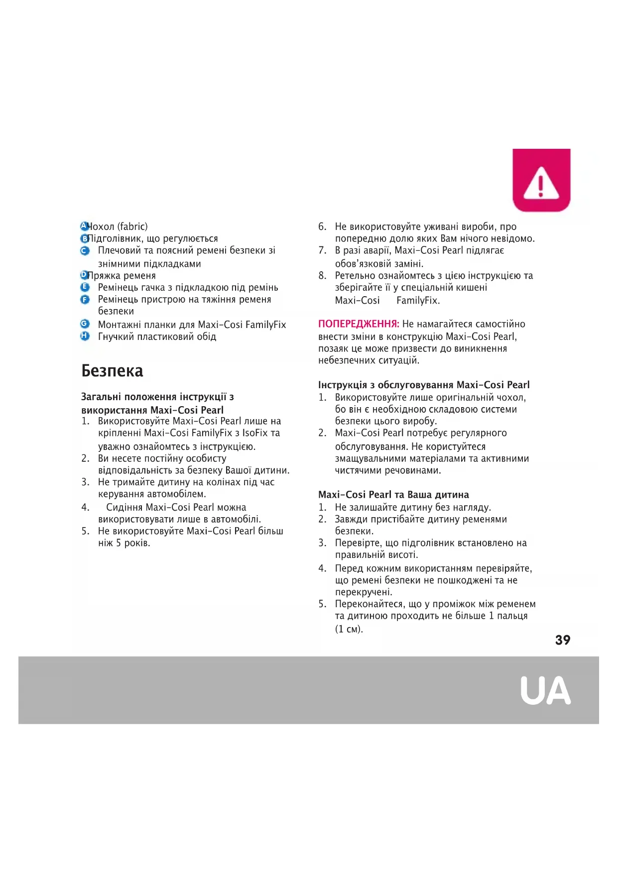 зберігайте її у спеціальній кишені Maxi-Cosi FamilyFix. ПОПЕРЕДЖЕННЯ: Не намагайтеся самостійно внести зміни в конструкцію Maxi-Cosi Pearl, позаяк це може призвести до виникнення небезпечних ситуацій. Інструкція з обслуговування Maxi-Cosi Pearl