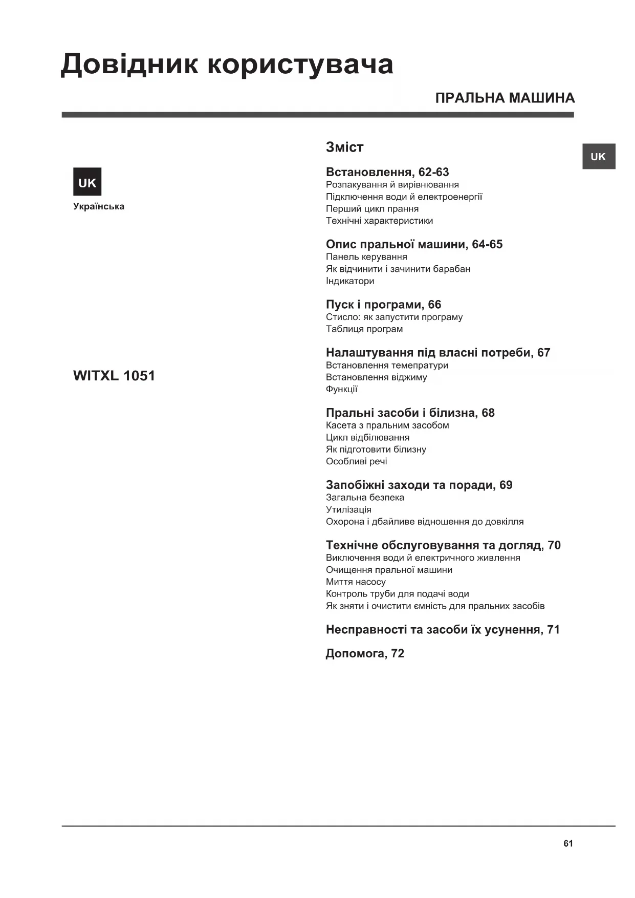ПОСІБНИК КОРИСТУВАЧА WITXL 1051 INDESIT