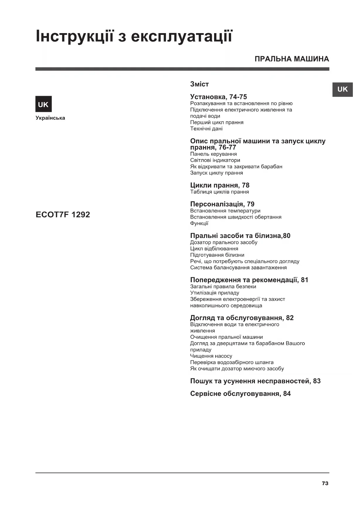 Установка, 74-75 Розпакування та встановлення по рівню Підключення електричного живлення та подачі води Перший цикл прання Технічні дані Опис пральної машини та запуск циклу прання, 76-77 Панель керування Світлові індикатори Як відкривати та закривати барабан Запуск циклу прання Цикли прання, 78 Таблиця циклів прання Персоналізація, 79 Встановлення температури Встановлення швидкості обертання