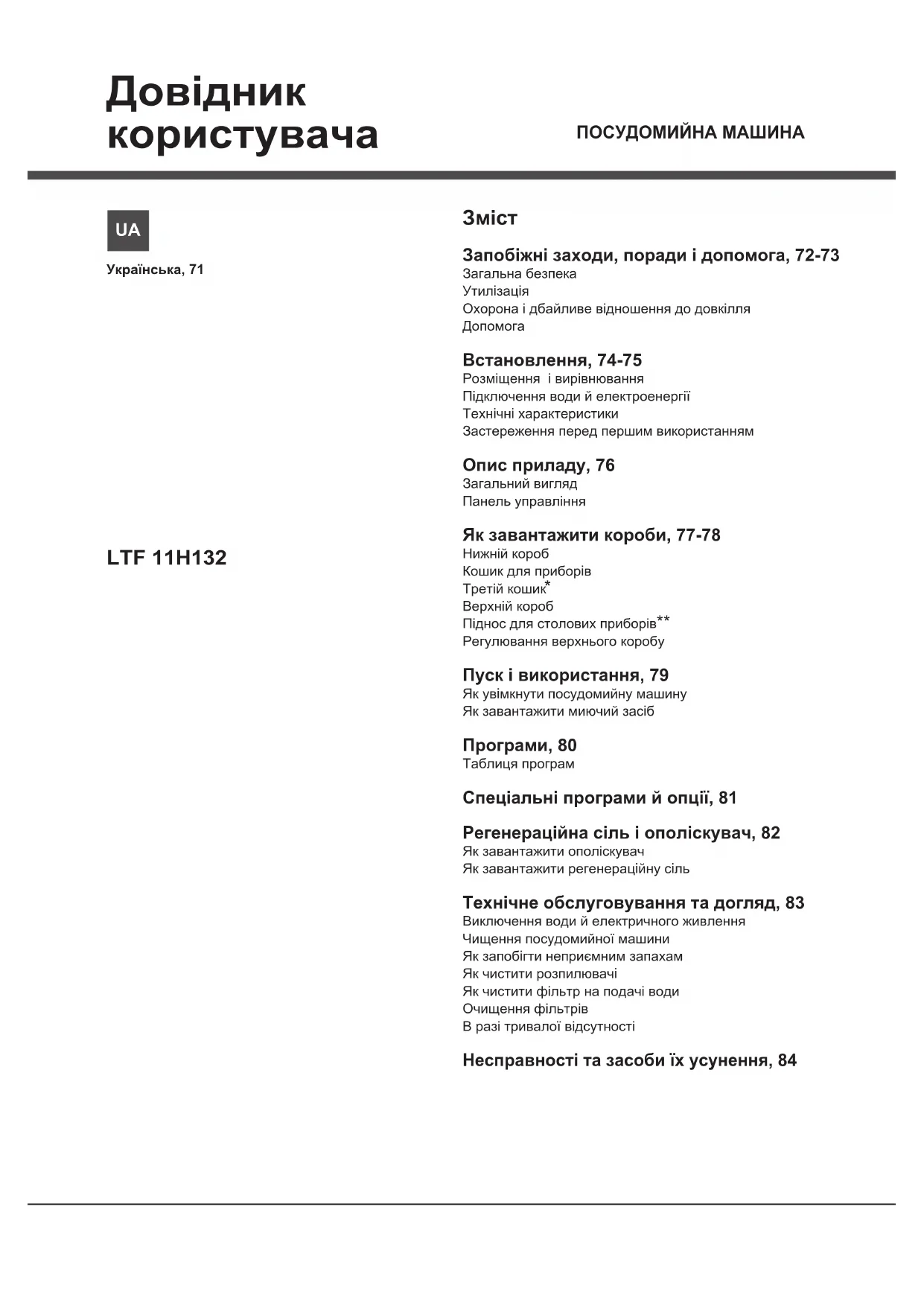 Регулювання верхнього коробу Пуск і використання, 79 Як увiмкнути посудомийну машину Як завантажити миючий засiб Програми, 80 Таблиця програм Спеціальні програми й опції, 81 Регенераційна сіль і ополіскувач, 82 Як завантажити ополіскувач Як завантажити регенерацiйну сiль Технічне обслуговування та догляд, 83 Виключення води й електричного живлення Чищення посудомийної машини Як запобiгти неприємним запахам Як чистити розпилювачi Як чистити фільтр на подачі води Очищення фільтрів В разі тривалої відсутності Несправності та засоби їх усунення, 84 LTF 11H132 Українська, 71 UA72