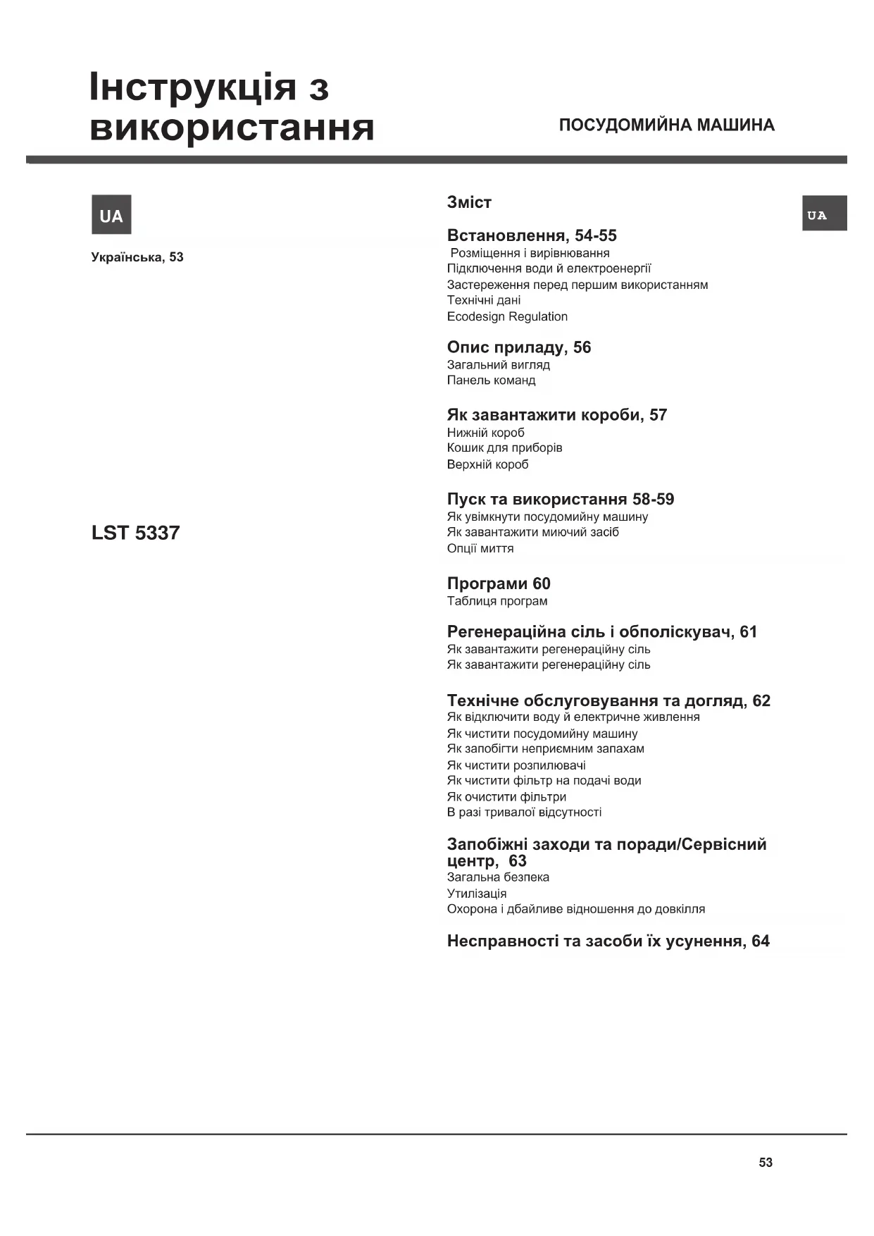 Встановлення, 54-55 Розміщення і вирівнюванняПідключення води й електроенергіїЗастереження перед першим використаннямТехнiчнi данiEcodesign Regulation Опис приладу, 56 Загальний виглядПанель команд Як завантажити короби, 57 Нижній коробКошик для приборiвВерхній короб Пуск та використання 58-59 Як увiмкнути посудомийну машинуЯк завантажити миючий засiбОпції миття Програми 60 Таблиця програм Регенераційна сіль i обполiскувач, 61 Як завантажити регенерацiйну сiльЯк завантажити регенерацiйну сiль Технічне обслуговування та догляд, 62 Як відключити воду й електричне живленняЯк чистити посудомийну машинуЯк запобiгти неприємним запахамЯк чистити розпилювачiЯк чистити фiльтр на подачi водиЯк очистити фiльтриВ разі тривалої відсутності Запобіжні заходи та поради/Сервісний центр, 63 Загальна безпекаУтилiзацiяОхорона і дбайливе відношення до довкілля Несправності та засоби їх усунення, 64 LST 5337 Інструкція з використання