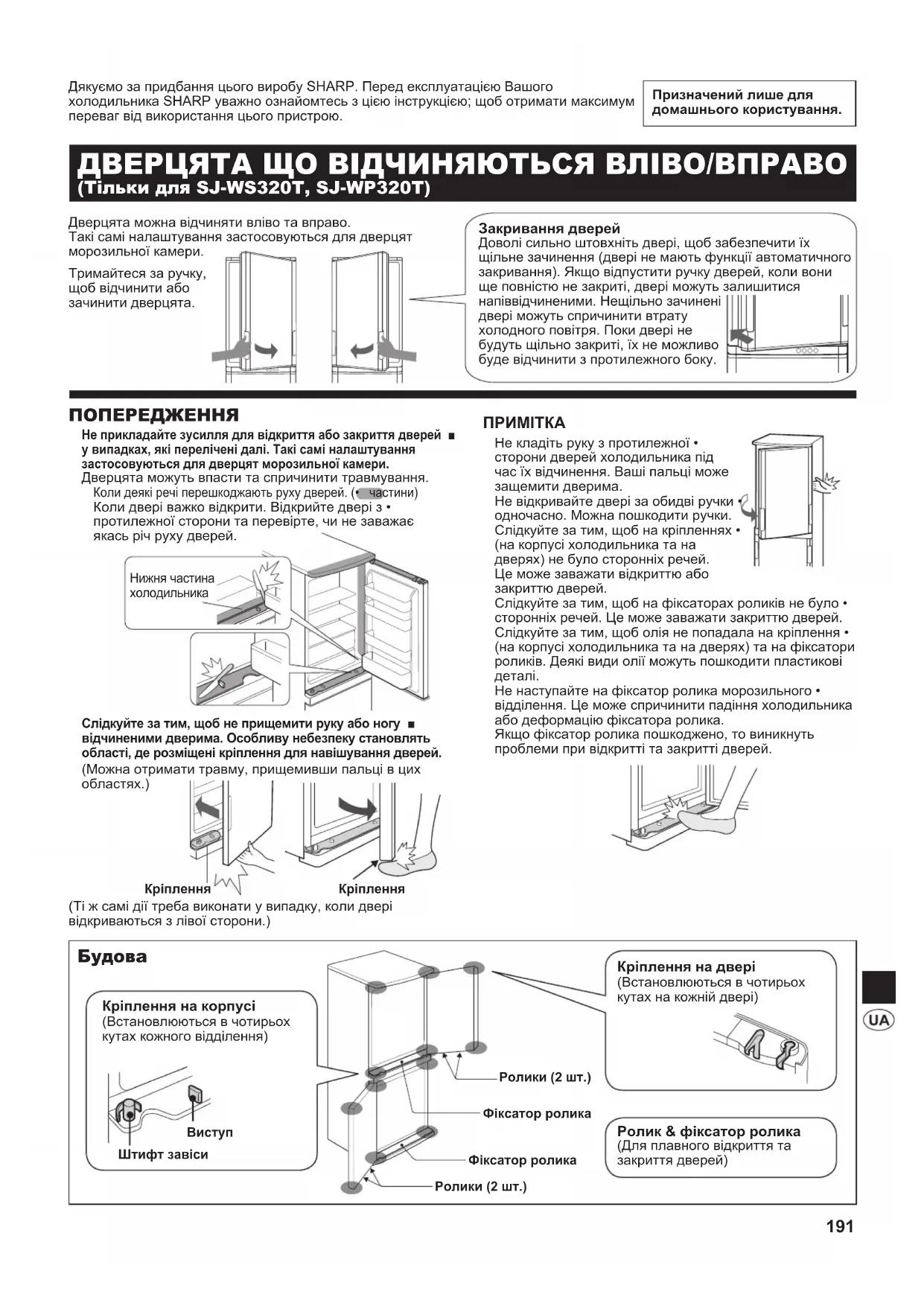 ДВЕРЦЯТА ЩО ВІДЧИНЯЮТЬСЯ ВЛІВО/ВПРАВО (Тільки для SJ-WS320T, SJ-WP320T) Дверцята можна відчиняти вліво та вправо.Такі самі налаштування застосовуються для дверцят морозильної камери.Тримайтеся за ручку, щоб відчинити або зачинити дверцята. Закривання дверей Доволі сильно штовхніть двері, щоб забезпечити їх щільне зачинення (двері не мають функції автоматичного закривання). Якщо відпустити ручку дверей, коли вони ще повністю не закриті, двері можуть залишитися напіввідчиненими. Нещільно зачинені двері можуть спричинити втрату холодного повітря. Поки двері не будуть щільно закриті, їх не можливо буде відчинити з протилежного боку.(Ті ж самі дії треба виконати у випадку, коли двері відкриваються з лівої сторони.) Кріплення на корпусі (Встановлюються в чотирьох кутах кожного відділення)Фіксатор роликаРолики (2 шт.)Ролики (2 шт.)Фіксатор ролика Кріплення на двері (Встановлюються в чотирьох кутах на кожній двері) Ролик & фіксатор ролика (Для плавного відкриття та закриття дверей)Дякуємо за придбання цього виробу SHARP. Перед експлуатацією Вашого холодильника SHARP уважно ознайомтесь з цією інструкцією; щоб отримати максимум переваг від використання цього пристрою. Нижня частина холодильникаКріпленняВиступШтифт завісиКріплення(B107)_BOOK-E.indb 191 2010/09/28 16:30:28192 Даний холодильник містить легкозаймисту ■ охолоджуючу рідину (R600a: ізобутан) та ізоляційний газ (циклопентан). Дотримуйтесь наступних правил, щоб уникнути пожежі та вибуху. Охолоджувальна система на задній панелі та • всередині холодильника містить охолоджуючу рідину. Оберігайте охолоджувальну систему від контакту з гострими предметами. Не використовуйте механічні пристрої або інші • засоби для прискорення процесу розморожування. (У даному холодильнику використовується система автоматичного розморожування.) Не використовуйте електричні пристрої всередині • холодильника. Використовуйте для освітлення холодильного • відділення тільки рекомендовані деталі. Не закривайте отвори для подачі повітря у • холодильнику. Забороняється використовувати вогненебезпечні • спреї (наприклад, аерозольний балон з фарбою) в безпосередній близькості до холодильника. Це може призвести до вибуху або пожежі. У випадку пошкодження охолоджувальної системи • перемістіть холодильник подалі від настінних розеток та відкритого полум'я. Відкрийте вікно та провітріть кімнату. Після цього зверніться до ауторизованого сервісного центру SHARP щодо ремонту. Даний холодильник підлягає спеціальній утилізації. • Відвезіть холодильник на завод із переробки легкозаймистої охолоджуючої рідини та ізоляційного