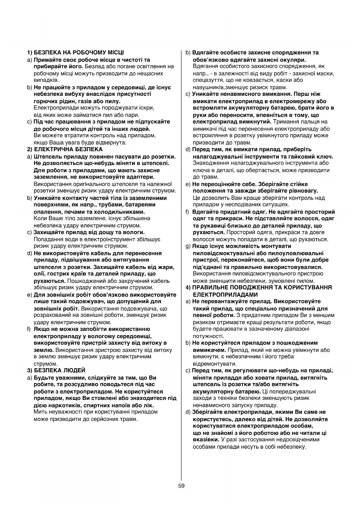 ЗАГАЛЬНІ ВКАЗІВКИ З ТЕХНІКИ БЕЗПЕКИ УВАГА! Прочитайте всі попередження і вказівки. Недодержання попереджень і вказівок може призводити до удару електричним струмом, пожежі та/ або серйозних травм. Добре зберігайте на майбутнє ці попередження і вказівки. Під поняттям “електроприлад” в цих попередженнях мається на увазі електроприлад, що працює від мережі (з електрокабелем) або від акумуляторної батареї (без електрокабелю).59