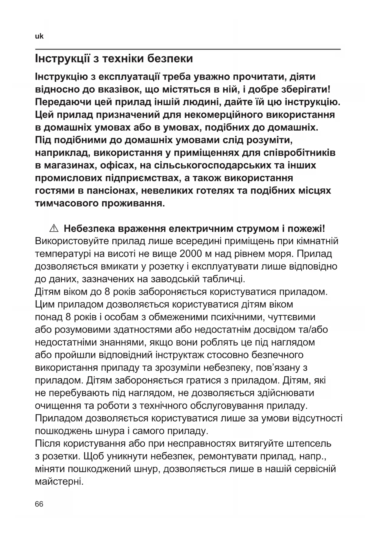 Інструкції з техніки безпеки Інструкцію з експлуатації треба уважно прочитати, діяти відносно до вказівок, що містяться в ній, і добре зберігати! Передаючи цей прилад іншій людині, дайте їй цю інструкцію. Цей прилад призначений для некомерційного використання в домашніх умовах або в умовах, подібних до домашніх. Під подібними до домашніх умовами слід розуміти, наприклад, використання у приміщеннях для співробітників в магазинах, офісах, на сільськогосподарських та інших промислових підприємствах, а також використання гостями в пансіонах, невеликих готелях та подібних місцях тимчасового проживання. A Небезпека враження електричним струмом і пожежі! Використовуйте прилад лише всередині приміщень при кімнатній температурі на висоті не вище 2000 м над рівнем моря. Прилад дозволяється вмикати у розетку і експлуатувати лише відповідно до даних, зазначених на заводській табличці. Дітям віком до 8 років забороняється користуватися приладом. Цим приладом дозволяється користуватися дітям віком понад 8 років і особам з обмеженими психічними, чуттєвими або розумовими здатностями або недостатнім досвідом та/або недостатніми знаннями, якщо вони роблять це під наглядом або пройшли відповідний інструктаж стосовно безпечного використання приладу та зрозуміли небезпеку, пов’язану з приладом. Дітям забороняється гратися з приладом. Дітям, які не перебувають під наглядом, не дозволяється здійснювати очищення та роботи з технічного обслуговування приладу. Приладом дозволяється користуватися лише за умови відсутності пошкоджень шнура і самого приладу. Після користування або при несправностях витягуйте штепсель з розетки. Щоб уникнути небезпек, ремонтувати прилад, напр., міняти пошкоджений шнур, дозволяється лише в нашій сервісній майстерні.67