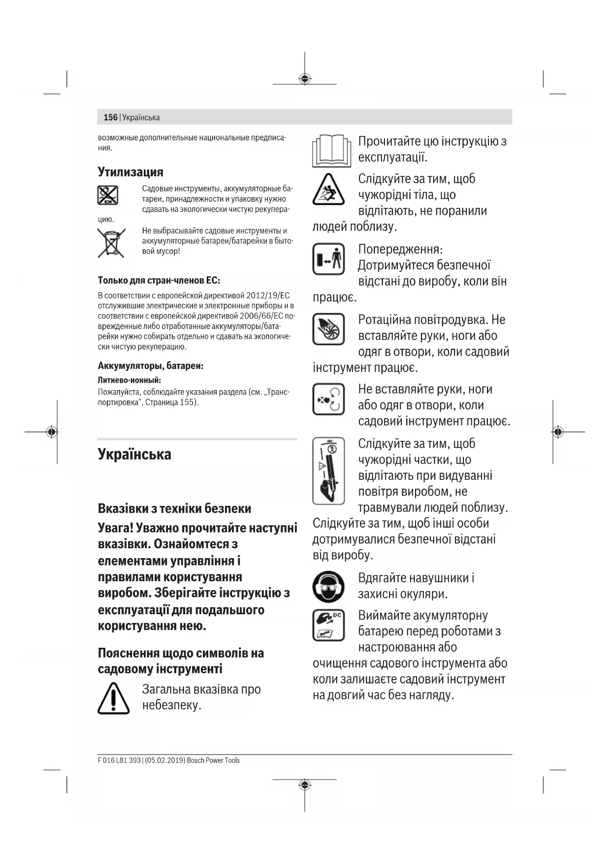 Ротаційна повітродувка. Не вставляйте руки, ноги або одяг в отвори, коли садовий інструмент працює. Не вставляйте руки, ноги або одяг в отвори, коли садовий інструмент працює. Слідкуйте за тим, щоб чужорідні частки, що відлітають при видуванні повітря виробом, не травмували людей поблизу. Слідкуйте за тим, щоб інші особи дотримувалися безпечної відстані від виробу. Вдягайте навушники і захисні окуляри. Виймайте акумуляторну батарею перед роботами з настроювання або очищення садового інструмента або коли залишаєте садовий інструмент на довгий час без нагляду. F 016 L81 393 | (05.02.2019) Bosch Power ToolsУкраїнська | 157 Не працюйте і не залишайте повітродувку надворі, коли