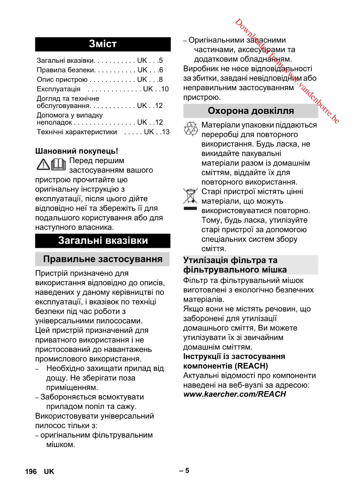 Фільтр та фільтрувальний мішок виготовлені з екологічно безпечних матеріалів. Якщо вони не містять речовин, що заборонені для утилізації домашнього сміття, Ви можете утилізувати їх зі звичайним домашнім сміттям. Інструкції із застосування компонентів (REACH) Актуальні відомості про компоненти наведені на веб-вузлі за адресою: www.kaercher.com/REACH