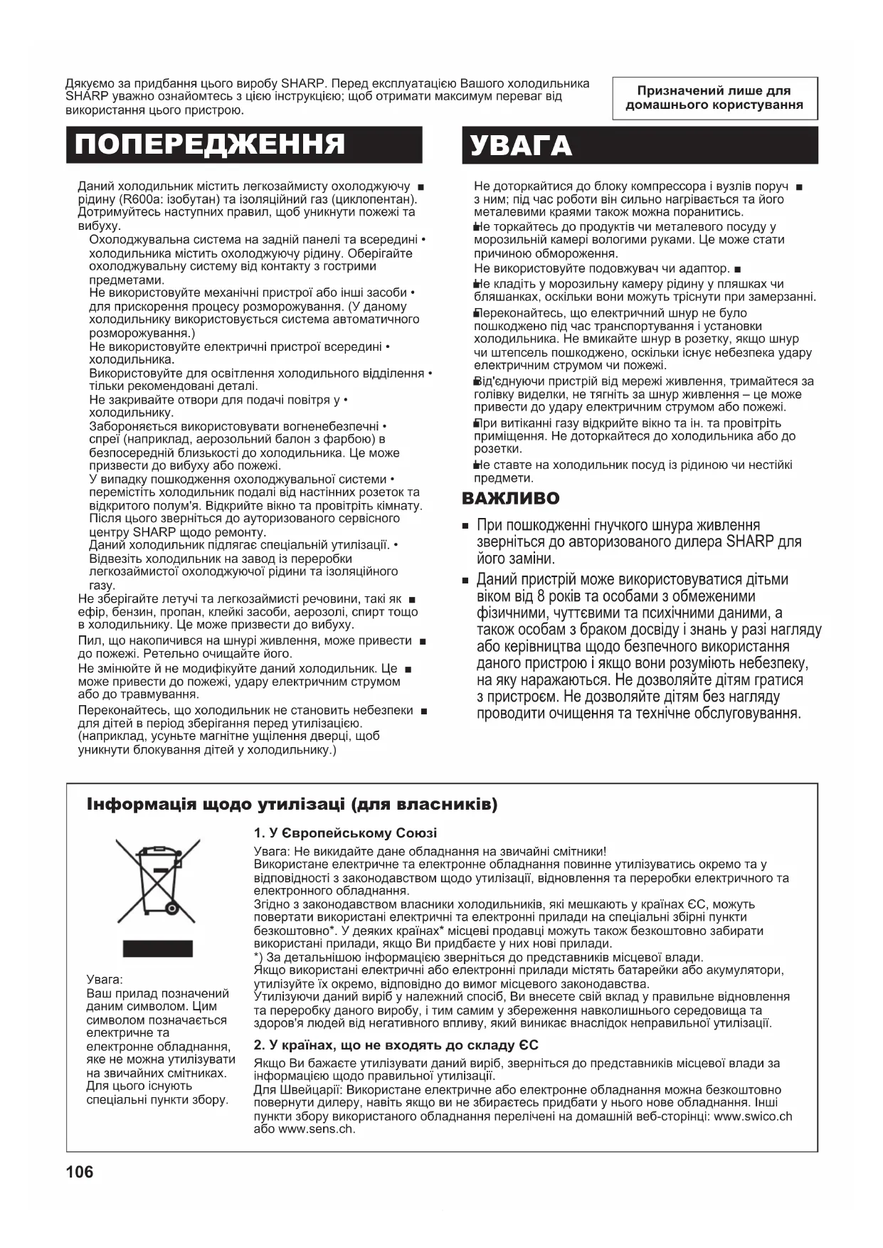 Дякуємо за придбання цього виробу SHARP. Перед експлуатацією Вашого холодильника