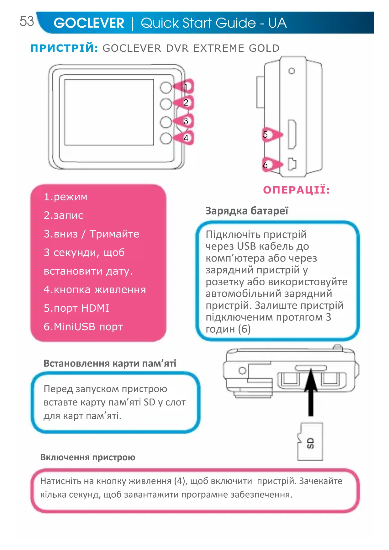 vo. Atención: Si el dispositivo se cuelga, usa el botón de reinicio. REQUISITOS DEL SISTEMA: Windows 2000/XP/ Vista/Siete, Mac OS 10.3.6 ó superior.53 GOCLEVER | Quick Start Guide - UA 1.режим 2.запис 3.вниз / Тримайте 3 секунди, щоб встановити дату. 4.кнопка живлення 5.порт HDMI 6.MiniUSB порт