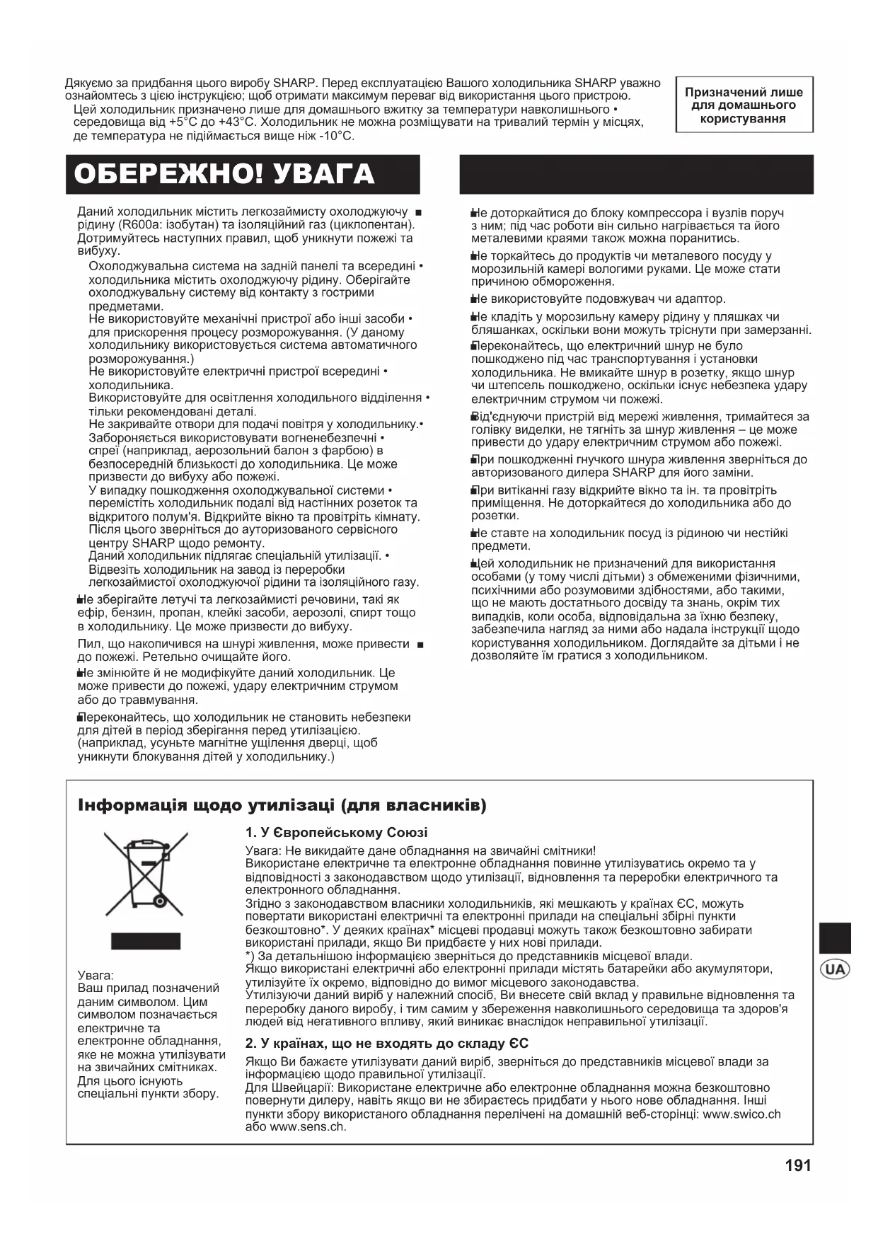 Дякуємо за придбання цього виробу SHARP. Перед експлуатацією Вашого холодильника SHARP уважно