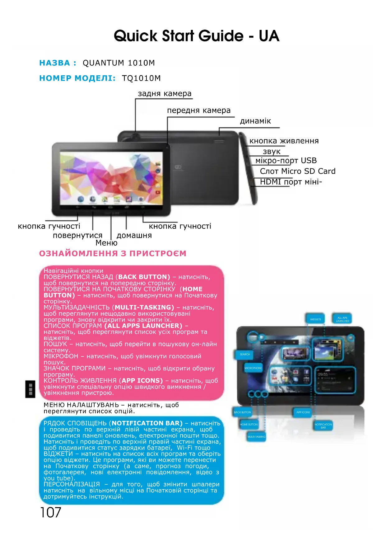 Навігаційні кнопкиПОВЕРНУТИСЯ НАЗАД (BACK BUTTON) – натисніть, щоб повернутися на попередню сторінку. ПОВЕРНУТИСЯ НА ПОЧАТКОВУ СТОРІНКУ (HOME BUTTON) – натисніть, щоб повернутися на Початкову сторінку.МУЛЬТИЗАДАЧНІСТЬ (MULTI-TASKING) – натисніть, щоб переглянути нещодавно використовувані програми, знову відкрити чи закрити їх.СПИСОК ПРОГРАМ (ALL APPS LAUNCHER) – натисніть, щоб переглянути список усіх програм та віджетів.ПОШУК – натисніть, щоб перейти в пошукову он-лайн систему. МІКРОФОН – натисніть, щоб увімкнути голосовий пошук. ЗНАЧОК ПРОГРАМИ – натисніть, щоб відкрити обрану програму.КОНТРОЛЬ ЖИВЛЕННЯ (APP ICONS) – натисніть, щоб увімкнути спеціальну опцію швидкого вимкнення / увімкнення пристрою. М Е Н Ю Н А Л А Ш Т У В А Н Ь – н а т и с н і т ь , щ о б переглянути список опцій. РЯДОК СПОВІЩЕНЬ (NOTIFICATION BAR) – натисніть і проведіть по верхній лівій частині екрана, щоб подивитися панелі оновлень, електронної пошти тощо. Натисніть і проведіть по верхній правій частині екрана, щоб подивитися статус зарядки батареї, Wi-Fi тощоВІДЖЕТИ – натисніть на список всіх програм та оберіть опцію віджети. Це програми, які ви можете перенести на Початкову сторінку (а саме, прогноз погоди, фотогалерея, нові електронні повідомлення, відео з you tube). ПЕРСОНАЛІЗАЦІЯ – для того, щоб змінити шпалери натисніть на вільному місці на Початковій сторінці та дотримуйтесь інструкцій. НАЗВА : QUANTUM 1010M НОМЕР МОДЕЛІ: TQ1010M ОЗНАЙОМЛЕННЯ З ПРИСТРОЄМ