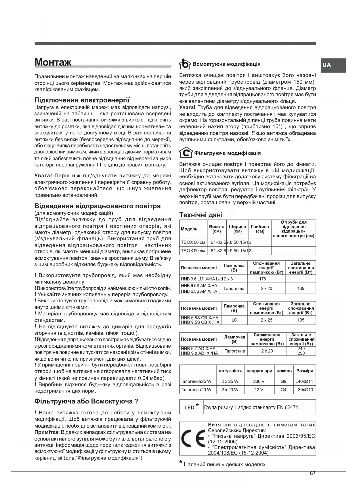 На горизонтальній ділянці труба повинна мати невеликий нахил вгору (приблизно 10°) , що сприяє відведенню повітря назовні. Якщо витяжка обладнана вугiльними фiльтрами, обов’язково знiмiть їх. Фiльтруюча модифiкацiя Витяжка очищає повітря і повертає його до кімнати. Щоб використовувати витяжку в цій модифікації, необхідно встановити додаткову систему фільтрації на основі активованого вугілля. Ця модифікація потребує дефлектор повітря, редуктор і вугільний/і фільтр/и. У верхній трубі має бути передбачені прорізи для випуску повітря, розташовані у верхній частині. Технічні дані МодельВисота (см)Ширина (см)Глибина (см)Ø труби для відведення відпрацьо- ваного повітря (см) TBOX 60 см61-82 59.8 50 15/12 TBOX 90 см61-82 89.9 50 15/12Позначка моделіЛампочка (В)Споживання енергії лампочкою (Вт)Загальне споживання енергії (Вт)HNB 9.6 LMI X/HA Led 2 x 3 176HNB 9.5S AM X/HAHNB 6.5S AM X/HAГалогенна 2 x 20 185Позначка моделіЛампочка (В)Споживання енергії лампочкою (Вт)Загальне споживання енергії (Вт)HNB 6.5S CB X/HAHNB 9.5S CB X /HALC 2 x 25 195Позначка моделіЛампочка (В)Споживання енергії лампочкою (Вт)Загальне споживання енергії (Вт)HNB 6.7 AD X/HAHNB 9.8 ADI X /HAГалогенна 2 x 20