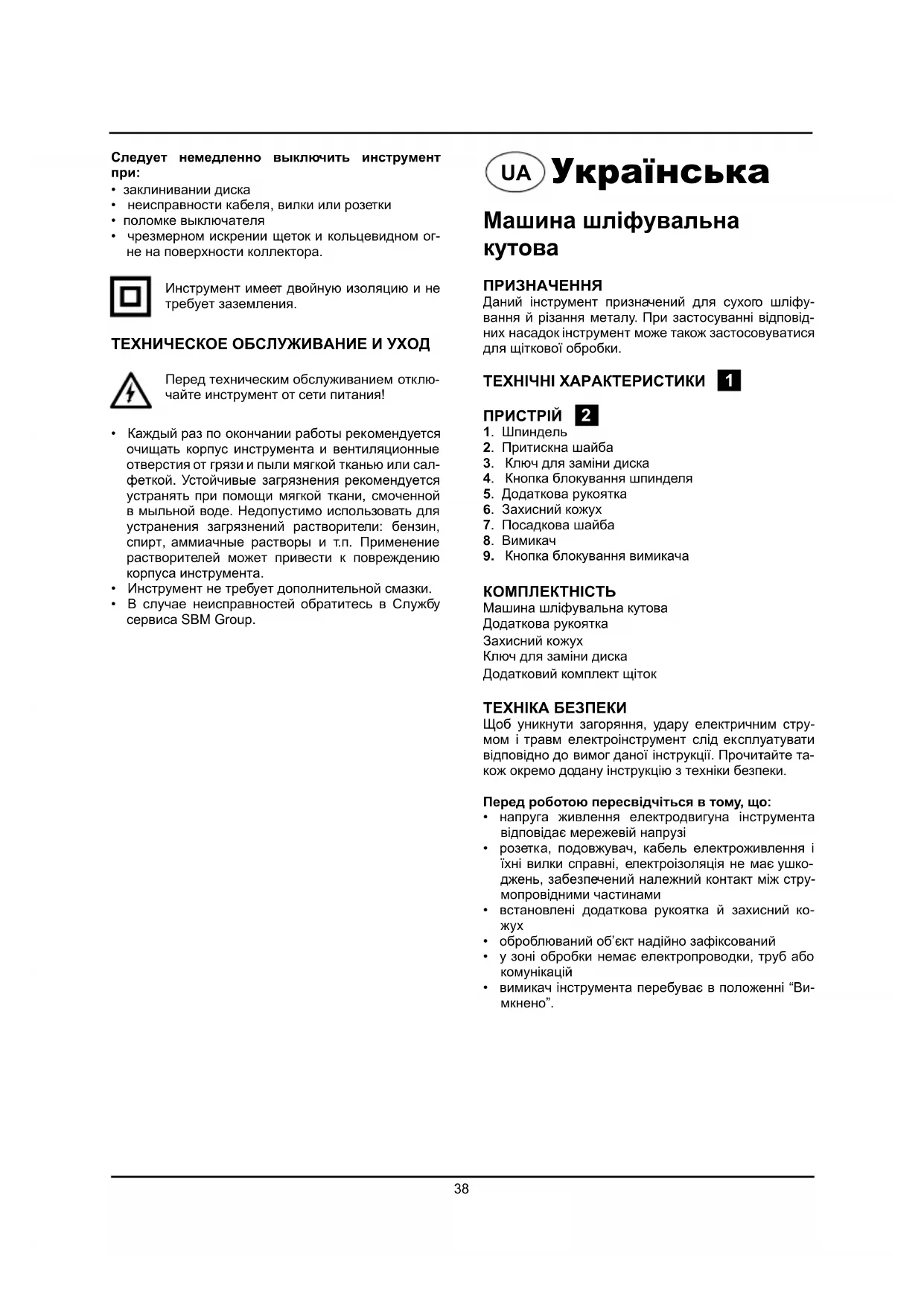 КОМПЛЕКТНІСТЬ Машина шліфувальна кутова Додаткова рукоятка Захисний кожух Ключ для заміни диска Додатковий комплект щіток ТЕХНІКА БЕЗПЕКИ Щоб уникнути загоряння, удару електричним стру- мом і травм електроінструмент слід експлуатувати відповідно до вимог даної інструкції. Прочитайте та- кож окремо додану інструкцію з техніки безпеки. Перед роботою пересвідчіться в тому, що: