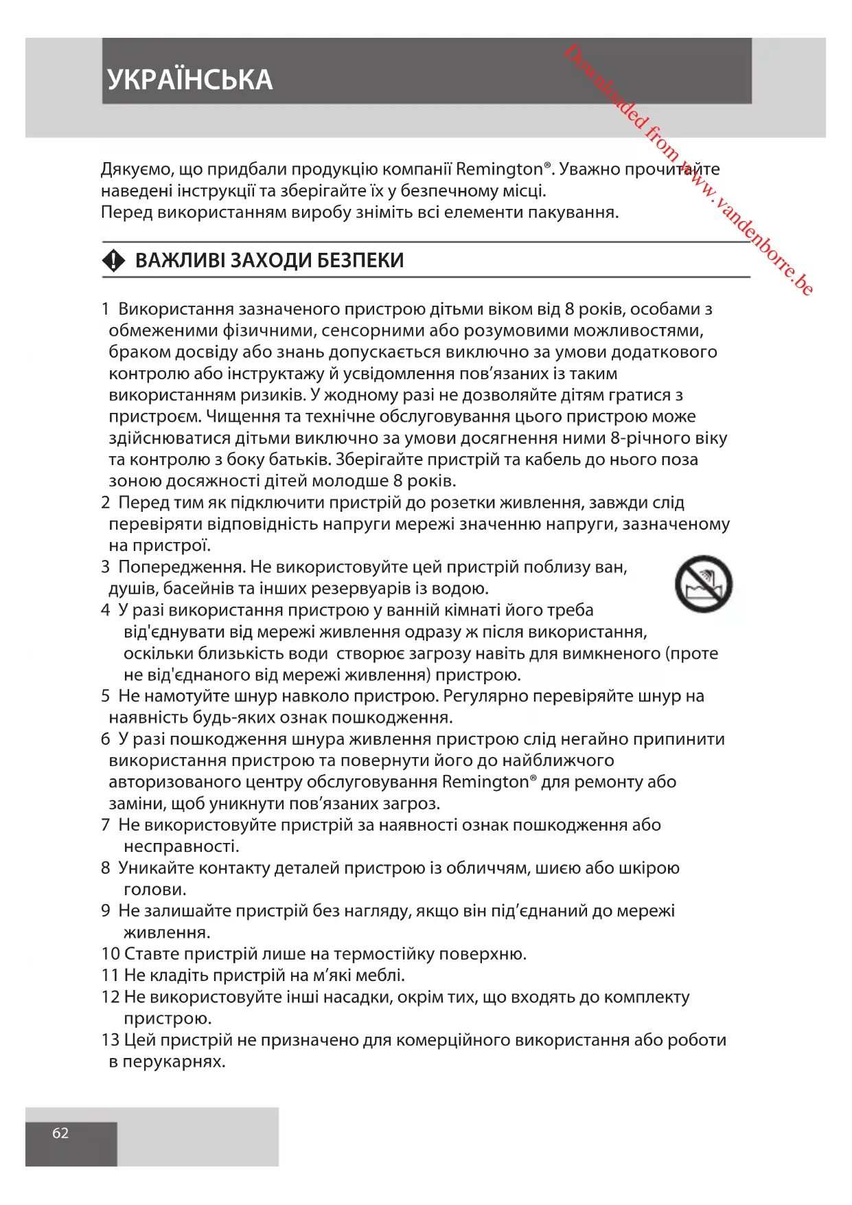 Downloaded from www.vandenborre.be62 Дякуємо, що придбали продукцію компанії Remington®. Уважно прочитайте наведені інструкції та зберігайте їх у безпечному місці. Перед використанням виробу зніміть всі елементи пакування. F ВАЖЛИВІ ЗАХОДИ БЕЗПЕКИ 1 Використання зазначеного пристрою дітьми віком від 8 років, особами з обмеженими фізичними, сенсорними або розумовими можливостями, браком досвіду або знань допускається виключно за умови додаткового контролю або інструктажу й усвідомлення пов’язаних із таким використанням ризиків. У жодному разі не дозволяйте дітям гратися з пристроєм. Чищення та технічне обслуговування цього пристрою може здійснюватися дітьми виключно за умови досягнення ними 8-річного віку та контролю з боку батьків. Зберігайте пристрій та кабель до нього поза зоною досяжності дітей молодше 8 років. 2 Перед тим як підключити пристрій до розетки живлення, завжди слід перевіряти відповідність напруги мережі значенню напруги, зазначеному на пристрої. 3 Попередження. Не використовуйте цей пристрій поблизу ван, душів, басейнів та інших резервуарів із водою. 4 У разі використання пристрою у ванній кімнаті його треба від'єднувативідмережіживленняодразужпіслявикористання, оскількиблизькістьводистворюєзагрозунавітьдлявимкненого(проте невід'єднаноговідмережіживлення)пристрою. 5 Не намотуйте шнур навколо пристрою. Регулярно перевіряйте шнур на наявність будь-яких ознак пошкодження. 6 У разі пошкодження шнура живлення пристрою слід негайно припинити використання пристрою та повернути його до найближчого авторизованого центру обслуговування Remington® для ремонту або заміни, щоб уникнути пов’язаних загроз. 7 Не використовуйте пристрій за наявності ознак пошкодження або несправності. 8 Уникайте контакту деталей пристрою із обличчям, шиєю або шкірою