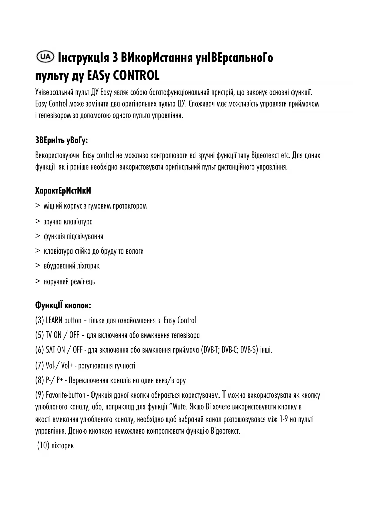 TV ali sprejemnik ne reagira na Easy control > Baterije v Easy control je potrebno zamenjati > Funkcija »učenja« ni bila uspešna za posamezni gumb. V tem primeru ponovite funkcijo »učenja« za posamezni gumb dokler zadeva ne deluje. > Razdalja med TV ali sprejemnikom in Easy control je prevelika (max. razdalja je 5-7 m) > Easy control ni usmerjen v TV ali sprejemnik. Easy control držite v smeri TV ali sprejemnika. LED (4) ne prične utripati (glejte točko e. pri funkciji »učenja«) > Baterije originalnega upravljalnika so prešibke > Gumb na originalnem upravljalniku ne deluje > Razdalja med IR senzorji Easy control in originalnim upravljalnikom je prevelika. IZRABLJENE BATERIJE Iztrošenih baterij ne mečite med gospodinjske odpadke. Baterije vrnite prodajalcu ali pa jih oddajte v reciklažo v najbližjem zbirnem centru. Polnilnik ne mečite med gospodinjske odpake. Napravo vrnite prodajalcu ali pa jo oddajte v reciklažo v najbližjem zbirnem centru. OPOZORILO: > baterij ne vežite kratkostično > aku. baterije polnite pod nadzorom odrasle osebe> pred polnjenjem aku. baterije je potrebno baterije vzeti iz naprave > ne polnite primarnih oz. alkalnih baterij > izrabljene baterije vzemite iz naprave > ne mešajte med seboj novih in izrabljenih baterijskih vložkov > embalažo in navodila za uporabo shranite Garancijska izjava POOBLAŠČENI UVOZNIK IN SERVIS: RT-TRI, d.o.o., Borovec 31, 1236 Trzin tel: (01) 530 – 40 – 00 / info@rt-tri.si Garancijska izjava: RT - TRI d.o.o. garantira, da bo izdelek v garancijski dobi in ob pravilni uporabi v skladu z navodili brezhibno deloval. V tem obdobju se obvežemo, da bomo vsako morebitno tovarniško napako, hibo ali okvaro ugotovili in odpravili na sedežu podjetja RT- TRI d.o.o. v zakonsko predpisanem roku na lastne stroške. Garancijsko obdobje bomo podaljšali za čas, ko bo izdelek v po- pravilu. Garancijska doba prične teči z dnem prodaje izdelka končnemu uporabniku. V kolikor napake na napravi ne odpravimo v roku 45 dni, le tega zamenjamo z novim artiklom. Iz garancije so izvzeti naslednji primeri: - če ni predložene kopije računa - če je bil artikel kupljen pri pravnem subjektu izven območja Republike Slovenije (razvidno iz predložene kopije računa) - če je kupec nestrokovno oziroma malomarno ravnal z izdelkom oziroma ni ravnal v skladu z navodili za uporabo izdelka - če je v izdelek posegla nepooblaščena oseba - če so bili v aparat vgrajeni neoriginalni rezervni deli in / ali oprema - če so bile povzročene poškodbe pri transportu po izročitvi izdelka kupcu ali če so na aparatu mehanske poškodbe - poškodbe zaradi nepravilne montaže, zagona in vzdrževanje izdelka - poškodbe povzročene zaradi visokonapetostnih sunkov, višje sile, poplave, izlitja alkalnih oz. primarnih baterij - priložene so specifikacije izdelka, zato se je kupec dolžan pred nakupom seznaniti z njenimi lastnostmi. Garancijski rok: 36 mesecev Rok zagotovljenega servisiranja in dobave nadomestnih rezervnih delov: 9 let po preteku garancijeІнструкцІя з ВИкорИстання унІВерсальноГо пульту ду EASy CONTROL Універсальний пульт ДУ Easy являє собою багатофункціональний пристрій, що виконує основні функції. Easy Control може замінити два оригінальних пульта ДУ. Споживач має можливість управляти приймачем і телевізором за допомогою одного пульта управління. зВернІть уВаГу: Використовуючи Easy control не можливо контролювати всі зручні функції типу Відеотекст etc. Для даних функції як і раніше необхідно використовувати оригінальний пульт дистанційного управління. ХарактерИстИкИ > міцний корпус з гумовим протектором > зручна клавіатура > функція підсвічування > клавіатура стійка до бруду та вологи > вбудований ліхтарик > наручний ремінець ФункцІї кнопок: (3) LEARN button – тільки для ознайомлення з Easy Control (5) TV ON / OFF – для включення або вимкнення телевізора (6) SAT ON / OFF - для включення або вимкнення приймача (DVB-T; DVB-C; DVB-S) інші. (7) Vol-/ Vol+ - регулювання гучності (8) P-/ P+ - Переключення каналів на один вниз/вгору (9) Favorite-button - Функція даної кнопки обирається користувачем. ЇЇ можна використовувати як кнопку улюбленого каналу, або, наприклад для функції “Mute. Якщо Ві хочете використовувати кнопку в якості вмикання улюбленого каналу, необхідно щоб вибраний канал розташовувався між 1-9 на пульті управління. Даною кнопкою неможливо контролювати функцію Відеотекст. (10) ліхтарикІнструкцІя з безпекИ > Будь ласка, прочитайте інструкцію з експлуатації перед використанням > Ніколи не намагайтесь самостійно відкрити пристрій > Пристрій має бути захищений від впливу високих температур,вологи та рідин > Будь ласка, використовуйте тільки суху тканину для чищення пристрою > Зберігайте п