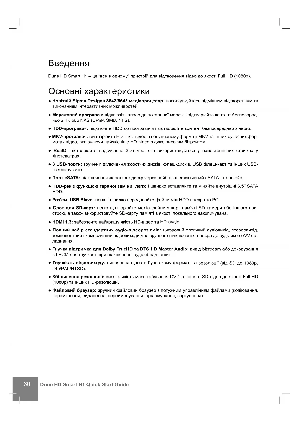 Dune HD Smart H1 – це “все в одному” пристрій для відтворення відео до якості Full HD (1080p). Основні характеристики ● Новітній Sigma Designs 8642/8643 медіапроцесор: насолоджуйтесь відмінним відтворенням та виконанням інтерактивних можливостей. ● Мережевий програвач: підключіть плеєр до локальної мережі і відтворюйте контент безпосеред- ньо з ПК або NAS (UPnP, SMB, NFS). ● HDD-програвач: підключіть HDD до програвача і відтворюйте контент безпосередньо з нього. ● MKV-програвач: відтворюйте HD- і SD-відео в популярному форматі MKV та інших сучасних фор
