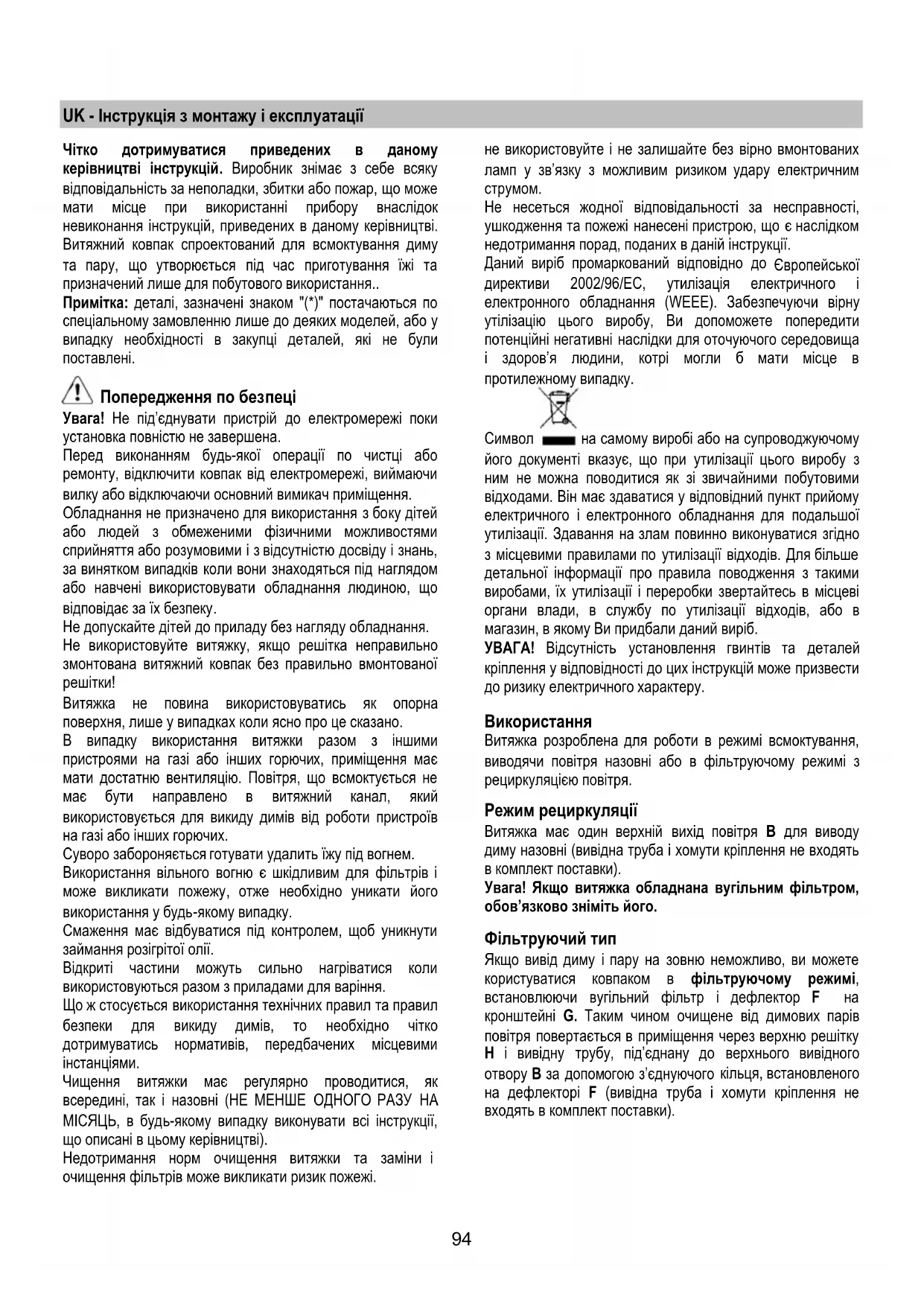 Увага! Якщо витяжка обладнана вугiльним фiльтром,