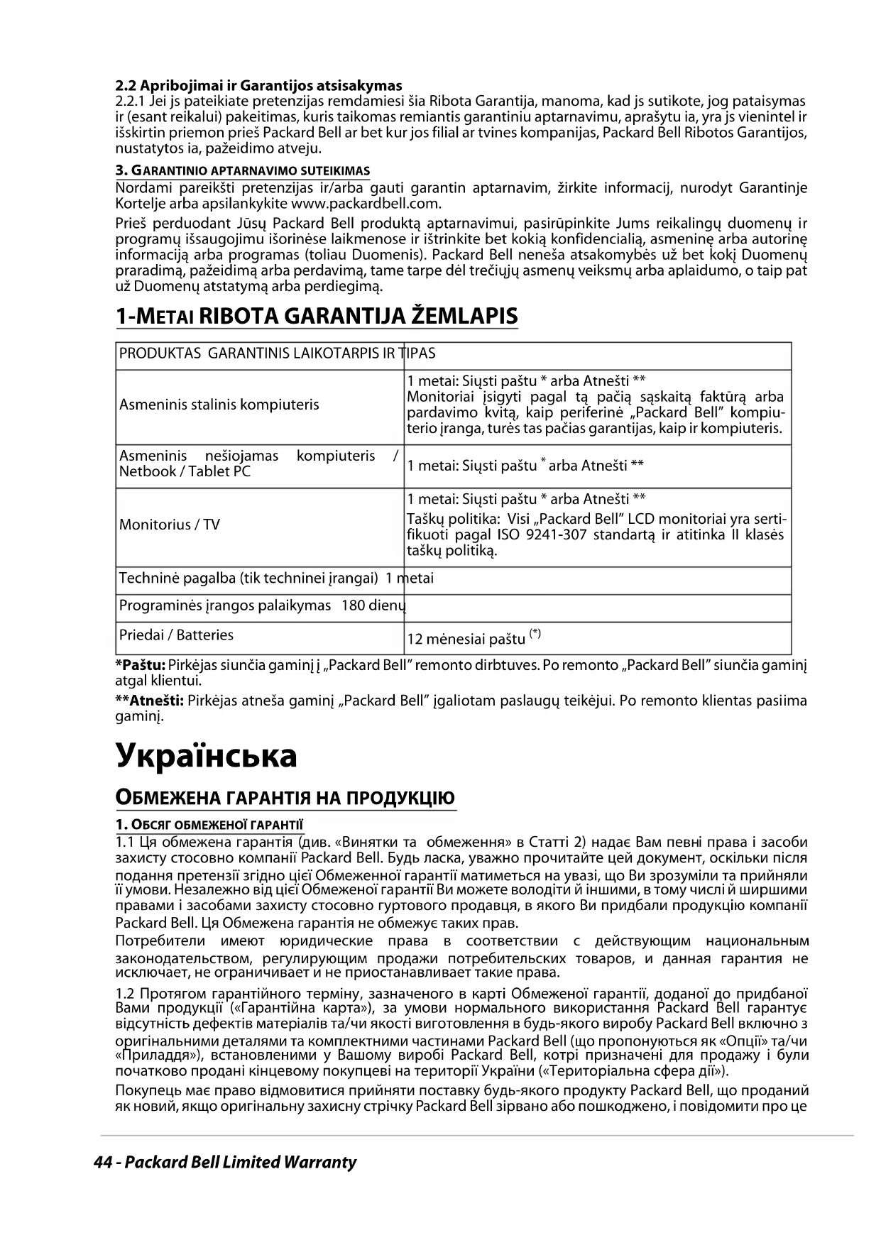 У МОВИ ГАРАНТІЇ 1. Гарантійним обслуговуванням забезпечується продукція Packard Bell, призначена для продажу в