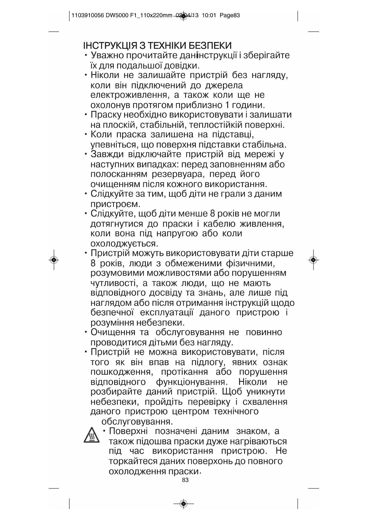 ВАЖЛИВО: в жодному разі не наражайте на дію пари людей або тварин.