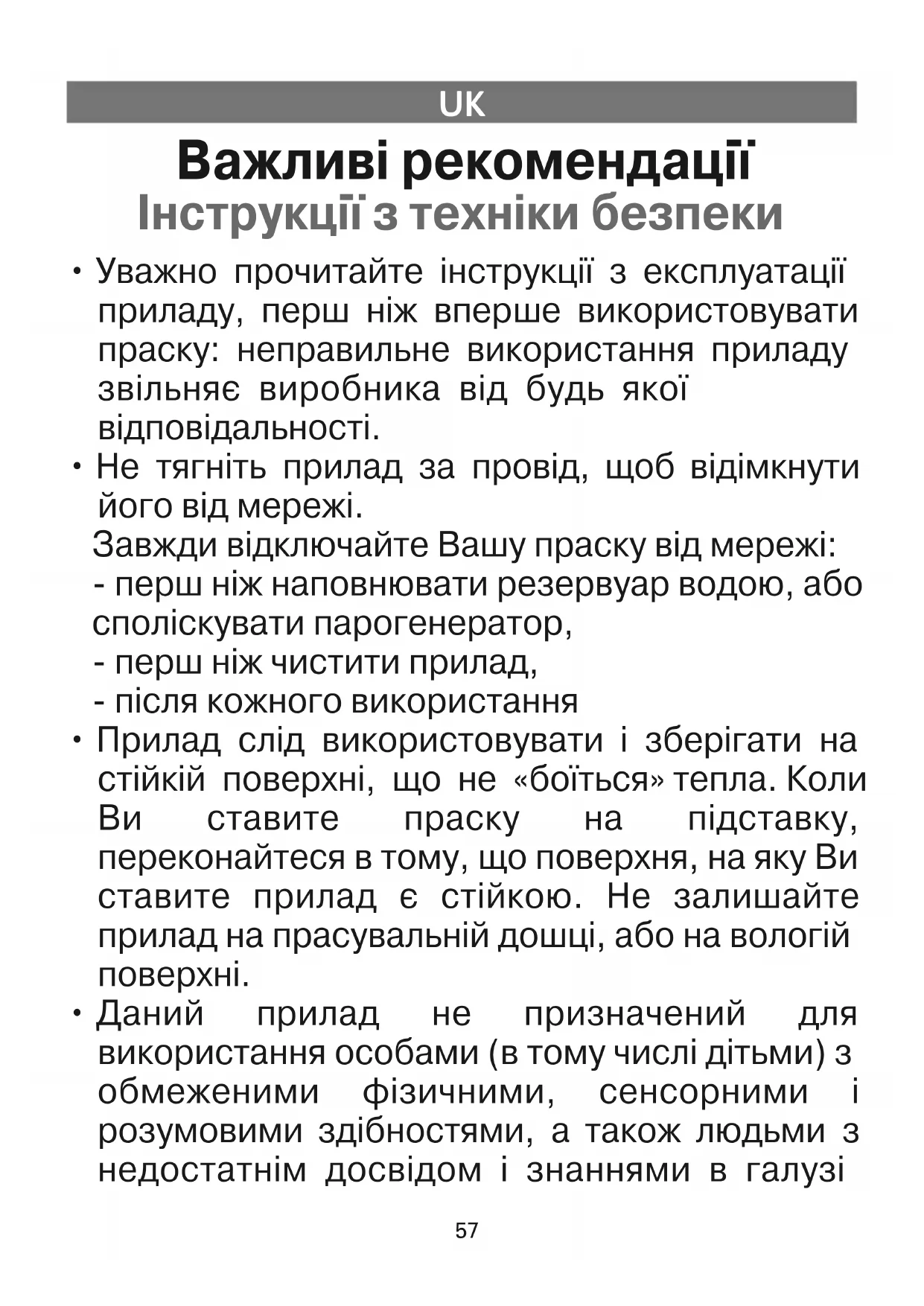 • Ваша парова праска – електричний прилад: його слід використовувати у
