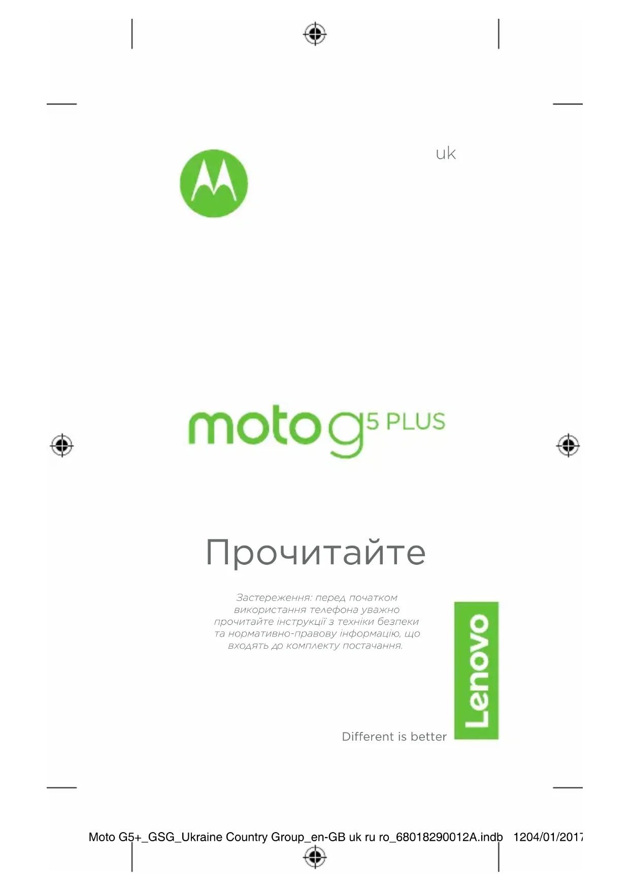 Dierent is better Застереження: перед початком використання телефона уважно прочитайте інструкції з техніки безпеки та нормативно-правову інформацію, що входять до комплекту постачання. Moto G5+_GSG_Ukraine Country Group_en-GB uk ru ro_68018290012A.indb 1204/01/2017 16:08:19Цей продукт відповідає вимогам застосовних державних або міжнародних нормативів щодо рівня радіочастотного випромінювання (рівня SAR) за умови використання у звичайному режимі, біля голови, на тілі або в сумці на відстані 0,5 см від тіла. Коефіцієнт SAR розраховано зі значним запасом надійності, що гарантує безпеку для всіх користувачів без обмежень за віком і станом здоров’я. TЗначення коефіцієнта SAR для вашого телефона можна переглянути на сторінці https://motorola.com/sar. Щоб переглянути додаткову інформацію щодо рівня SAR вашого телефона, виберіть проведіть пальцем угору