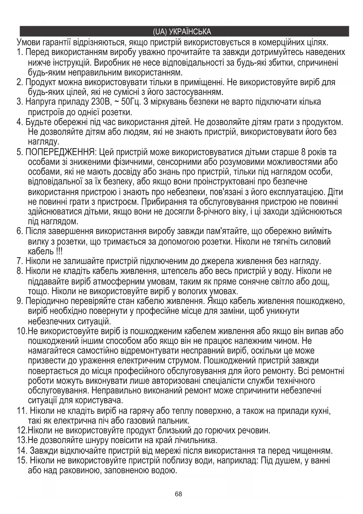 особами зі зниженими фізичними, сенсорними або розумовими можливостями або особами, які не мають досвіду або знань про пристрій, тільки під наглядом особи, відповідальної за їх безпеку, або якщо вони проінструктовані про безпечне використання пристрою і знають про небезпеки, пов'язані з його експлуатацією. Діти не повинні грати з пристроєм. Прибирання та обслуговування пристрою не повинні здійснюватися дітьми, якщо вони не досягли 8-річного віку, і ці заходи здійснюються під наглядом.