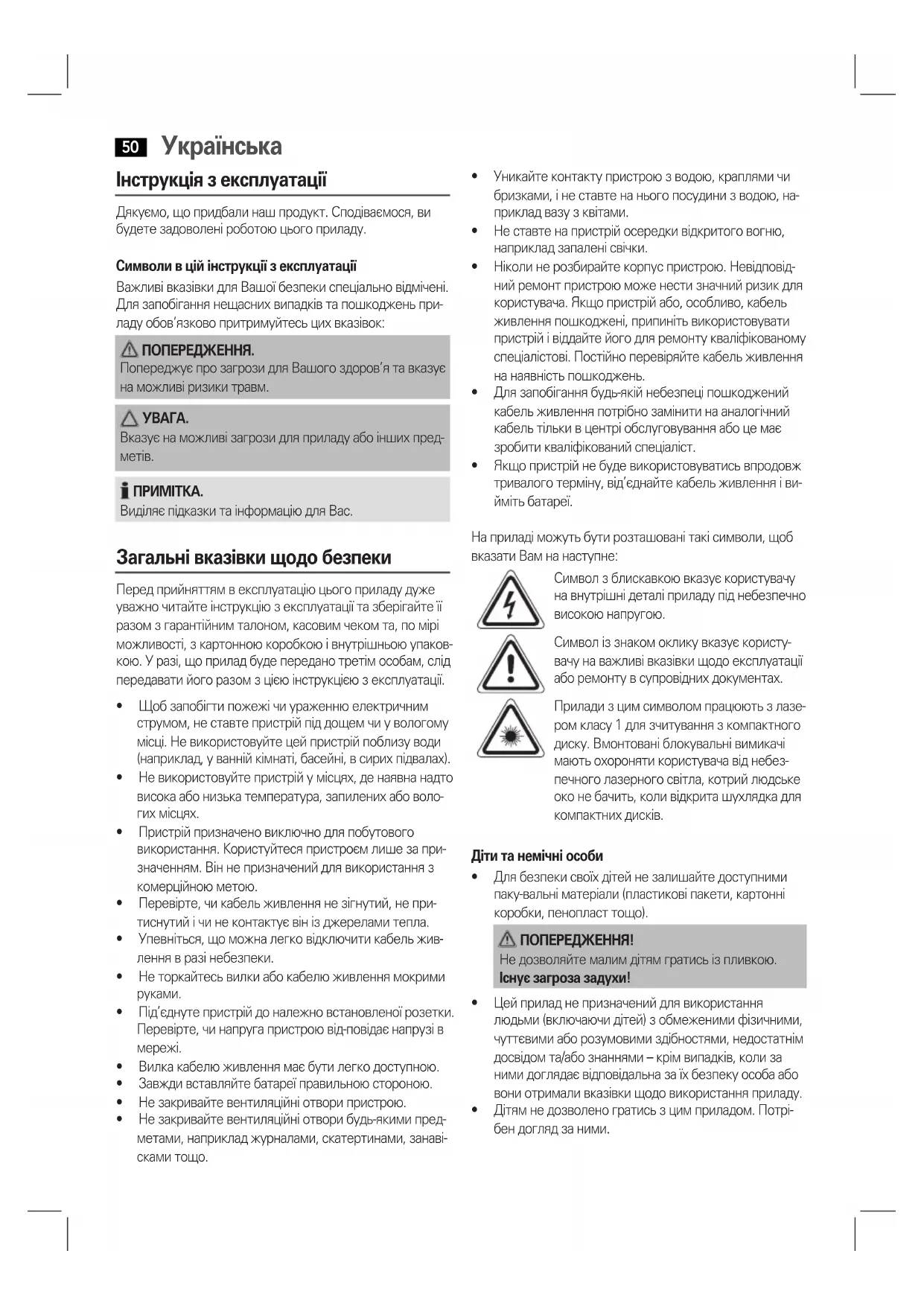 - Якщопристрійнебудевикористовуватисьвпродовж тривалого терміну, від’єднайте кабель живлення і ви- йміть батареї. На приладі можуть бути розташовані такі символи, щоб вказати Вам на наступне: Символ з блискавкою вказує користувачу на внутрішні деталі приладу під небезпечно високою напругою. Символ із знаком оклику вказує користу- вачу на важливі вказівки щодо експлуатації або ремонту в супровідних документах. Прилади з цим символом працюють з лазе- ром класу 1 для зчитування з компактного диску. Вмонтовані блокувальні вимикачі мають охороняти користувача від небез- печного лазерного світла, котрий людське око не бачить, коли відкрита шухлядка для компактних дисків. Діти та немічні особи