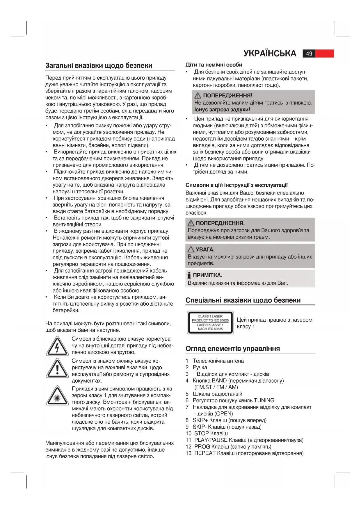 ВиділяєпідказкитаінформаціюдляВас. Спеціальні вказівки щодо безпеки Цейприладпрацюєзлазером класу 1. Огляд елементів управління 1 Телескопічна антена 2 Ручка 3 Відділокдлякомпакт-дисків 4 Кнопка BAND (перемикач діапазону) (FM.ST / FM / AM) 5 Шкала радіостанцій 6 Регулятор пошуку хвиль TUNING 7 Накладка для відкривання відділку для компакт - дисків (OPEN) 8 SKIP+ Клавіш (пошук вперед) 9 SKIP- Клавіш (пошук назад) 10 STOP Клавіш 11 PLAY/PAUSE Клавіш (відтворювання/пауза) 12 PROG Клавіш (запис у пам’яrь) 13 REPEAT Клавіш (повторюване відтворення)50