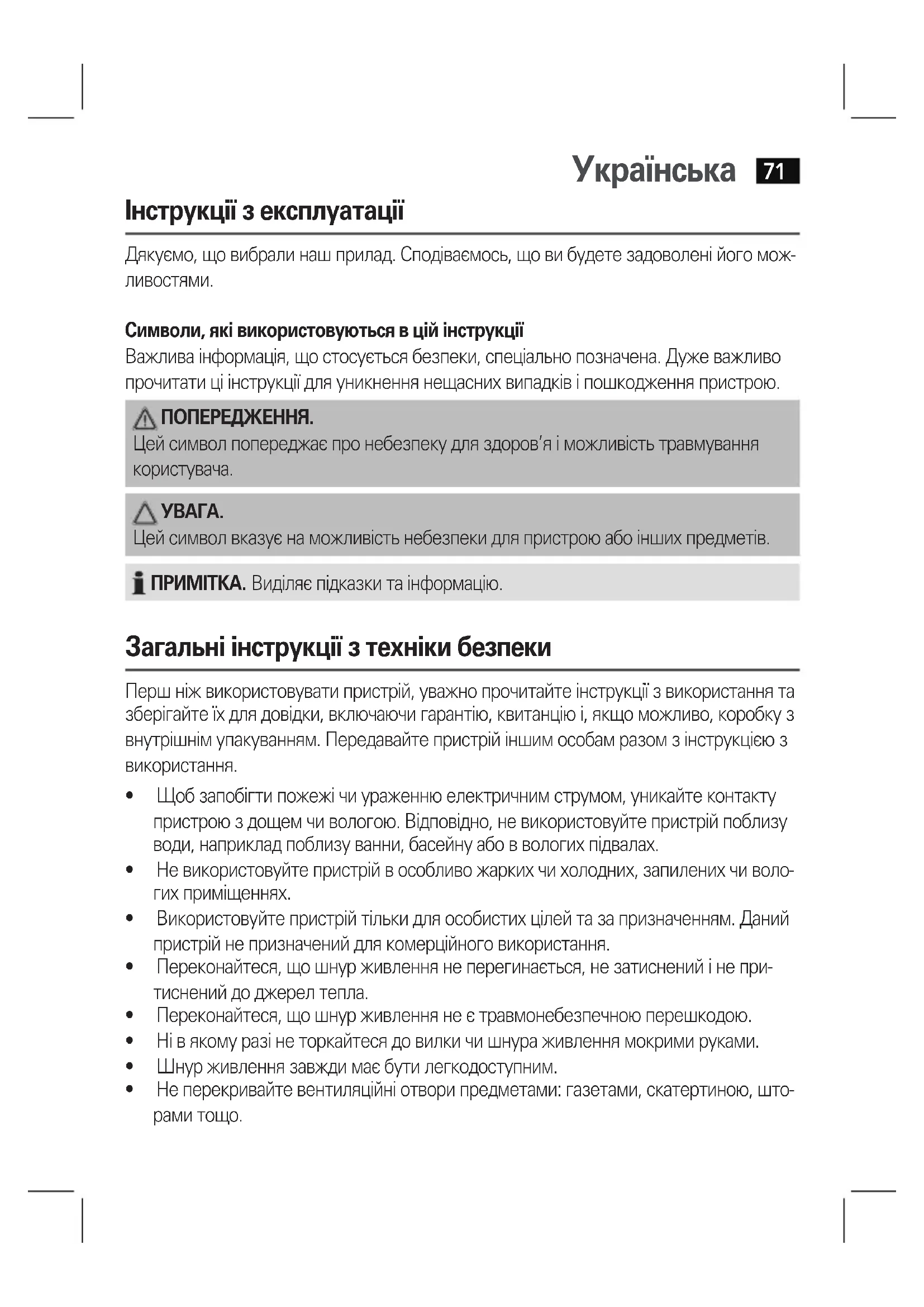 Символи, які використовуються в цій інструкції Важлива інформація, що стосується безпеки, спеціально позначена. Дуже важливо прочитати ці інструкції для уникнення нещасних випадків і пошкодження пристрою. ПОПЕРЕДЖЕННЯ. Цей символ попереджає про небезпеку для здоров’я і можливість травмування користувача.