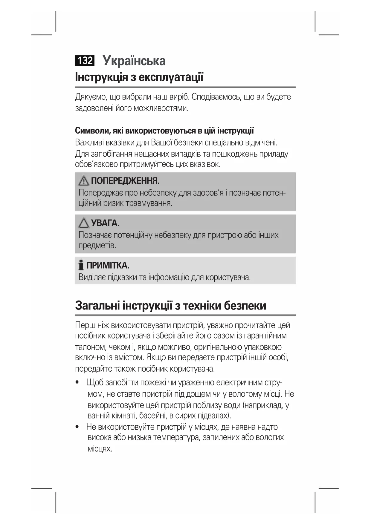 Інструкція з експлуатації Дякуємо, що вибрали наш виріб. Сподіваємось, що ви будете задоволені його можливостями. Символи, які використовуються в цій інструкції Важливі вказівки для Вашої безпеки спеціально відмічені. Для запобігання нещасних випадків та пошкоджень приладу обов’язково притримуйтесь цих вказівок. ПОПЕРЕДЖЕННЯ. Попереджає про небезпеку для здоров’я і позначає потен- ційний ризик травмування.
