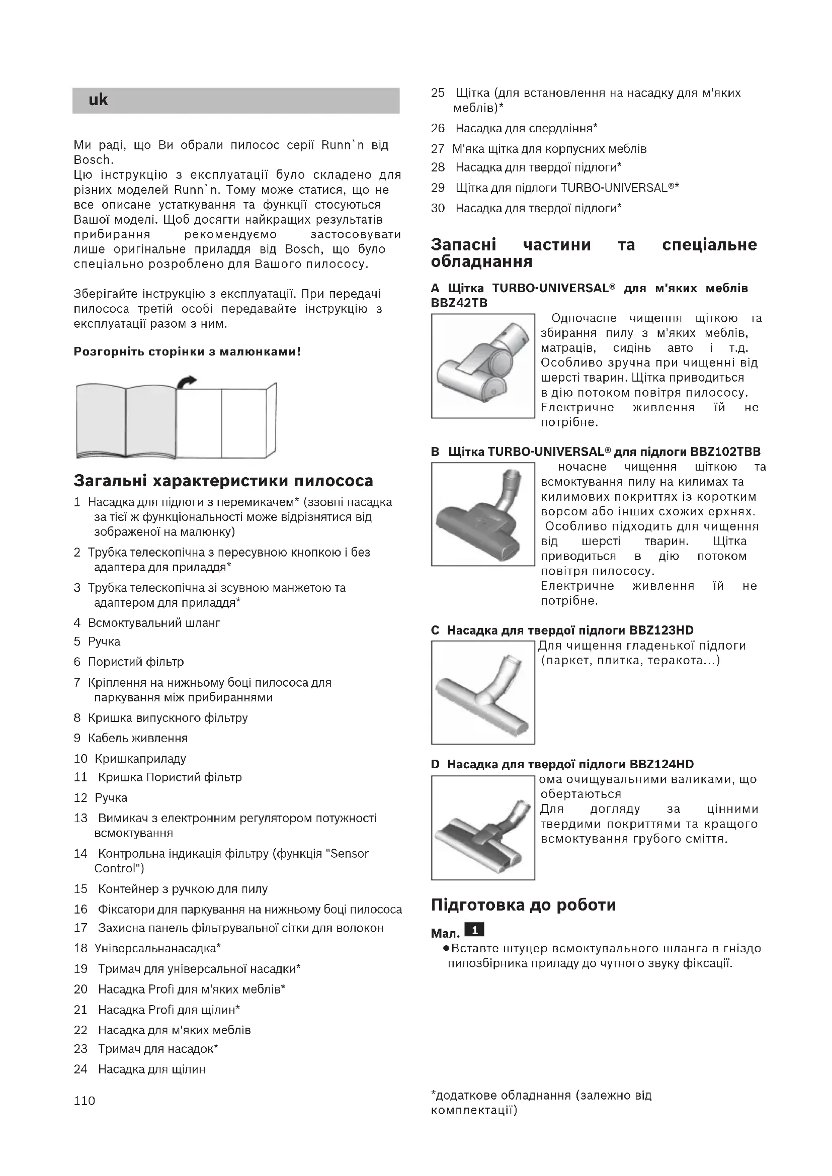 - în funcţie de dotare110 Ми раді, що Ви обрали пилосос серії Runn`n від Bosch. Цю інструкцію з експлуатації було складено для різних моделей Runn`n. Тому може статися, що не все описане устаткування та функції стосуються Вашої моделі. Щоб досягти найкращих результатів прибирання рекомендуємо застосовувати лише оригінальне приладдя від Bosch, що було спеціально розроблено для Вашого пилососу. Зберігайте інструкцію з експлуатації. При передачі пилососа третій особі передавайте інструкцію з експлуатації разом з ним. Розгорніть сторінки з малюнками! Загальні характеристики пилососа 1 Насадка для підлоги з перемикачем* (ззовні насадка за тієї ж функціональності може відрізнятися від зображеної на малюнку) 2 Трубка телескопічна з пересувною кнопкою і без адаптера для приладдя* 3 Трубка телескопічна зі зсувною манжетою та адаптером для приладдя* 4 Всмоктувальний шланг 5 Ручка 6 Пористий фільтр 7 Кріплення на нижньому боці пилососа для паркування між прибираннями 8 Кришка випускного фільтру 9 Кабель живлення 10 Кришка приладу 11 Кришка Пористий фільтр 12 Ручка 13 Вимикач з електронним регулятором потужності всмоктування 14 Контрольна індикація фільтру (функція "Sensor Control") 15 Контейнер з ручкою для пилу 16 Фіксатори для паркування на нижньому боці пилососа 17 Захисна панель фільтрувальної сітки для волокон 18 Універсальна насадка* 19 Тримач для універсальної насадки* 20 Насадка Profi для м'яких меблів* 21 Насадка Profi для щілин* 22 Насадка для м'яких меблів 23 Тримач для насадок* 24 Насадка для щілин 25 Щітка (для встановлення на насадку для м'яких