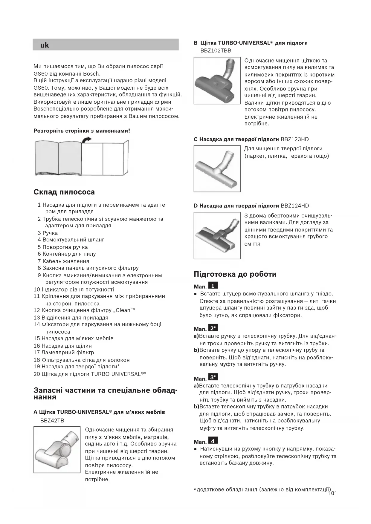 S60 від компанії Bosch. В цій інструкції з експлуатації надано різні моделі GS60. Тому, можливо, у Вашої моделі не буде всіх вищенаведених характеристик, обладнання та функцій. Використовуйте лише оригінальне приладдя фірми Boschспеціально розроблене для отримання макси- мального результату прибирання з Вашим пилососом. Розгорніть сторінки з малюнками! Склад пилососа 1 Насадка для підлоги з перемикачем та адапте- ром для приладдя 2 Трубка телескопічна зі зсувною манжетою та адаптером для приладдя 3 Ручка 4 Всмоктувальний шланг 5 Поворотна ручка 6 Контейнер для пилу 7 Кабель живлення 8 Захисна панель випускного фільтру 9 Кнопка вмикання/вимикання з електронним регулятором потужності всмоктування 10 Індикатор рівня потужності 11 Кріплення для паркування між прибираннями на стороні пилососа 12 Кнопка очищення фільтру „Clean“* 13 Відділення для приладдя 14 Фіксатори для паркування на нижньому боці