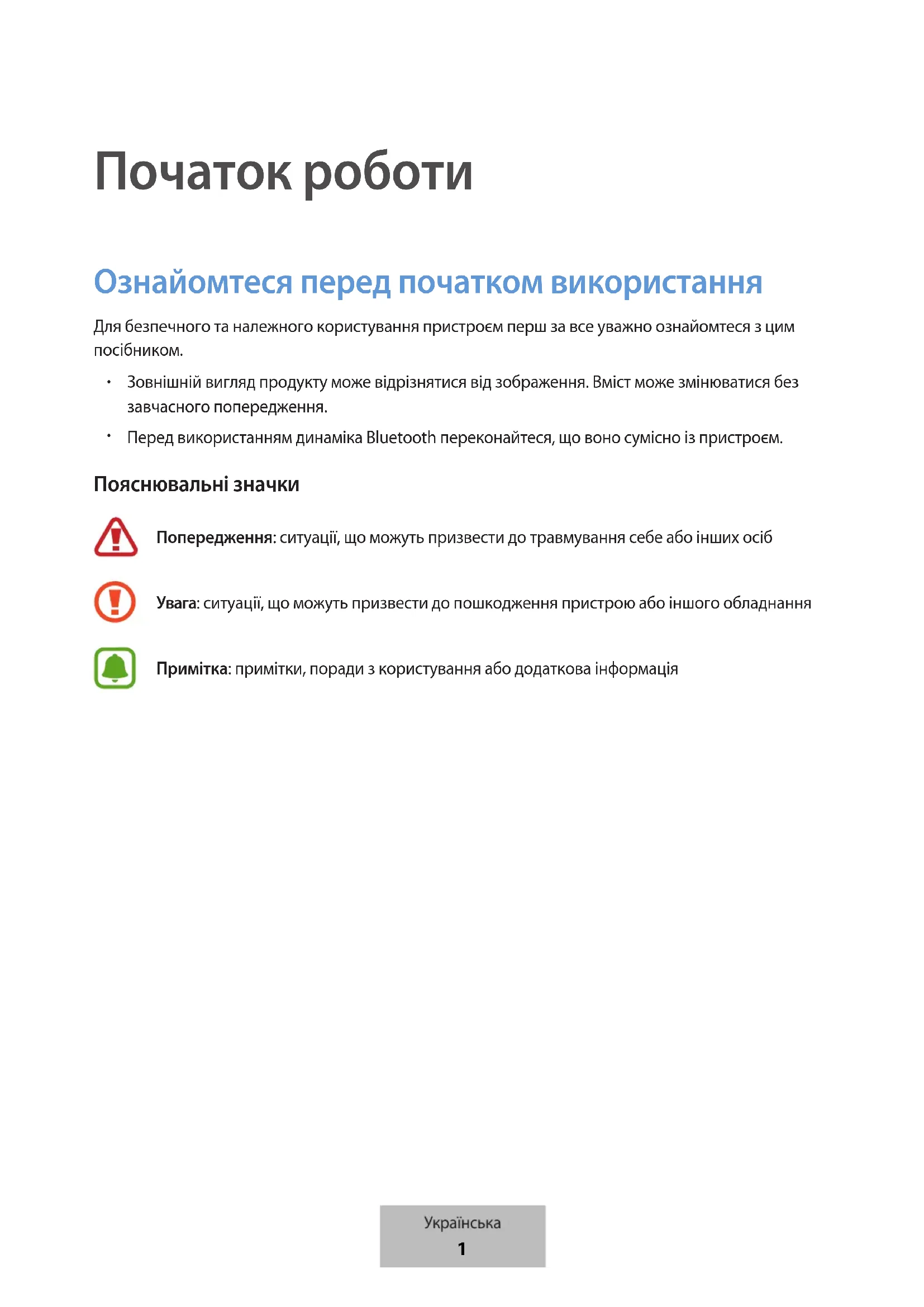 Початок роботи Ознайомтеся перед початком використання Для безпечного та належного користування пристроєм перш за все уважно ознайомтеся з цим посібником. Зовнішній вигляд продукту може відрізнятися від зображення. Вміст може змінюватися без завчасного попередження. Перед використанням динаміка Bluetooth переконайтеся, що воно сумісно із пристроєм. Пояснювальні значки Попередження: ситуації, що можуть призвести до травмування себе або інших осібУвага: ситуації, що можуть призвести до пошкодження пристрою або іншого обладнанняПримітка: примітки, поради з користування або додаткова інформація
