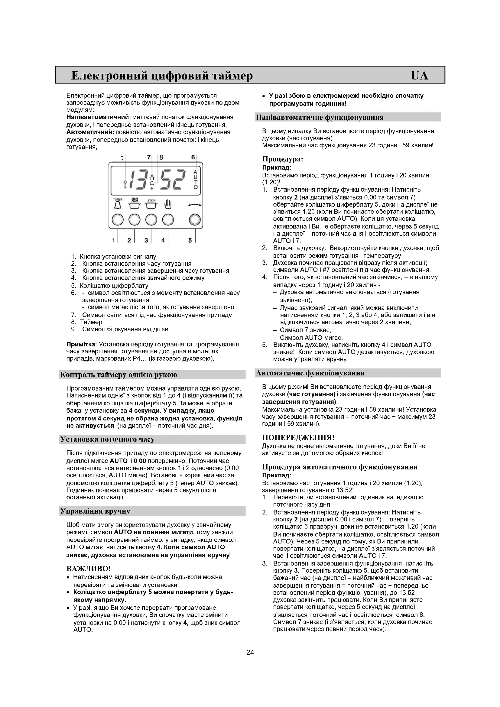 - У разі збою в електромережі необхідно спочатку програмувати годинник! Напівавтоматичне функціонування В цьому випадку Ви встановлюєте період функціонування духовки (час готування). Максимальний час функціонування 23 години і 59 хвилин!