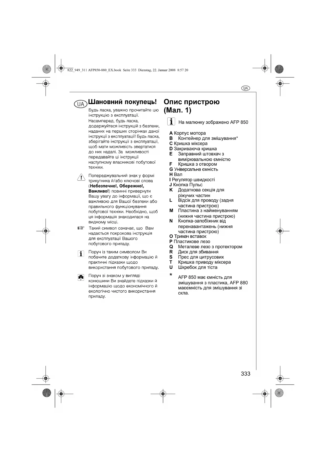 822_949_311 AFP850-880_EX.book Seite 333 Dienstag, 22. Januar 2008 8:57 20334 1 Правила безпеки Даний прилад відповідає прийнятим технологічним стандартам безпеки і вимогам законодавства України щодо безпеки побутових приладів. Проте, як виробник, ми вважаємо своїм обов'язком ознайомити вас з наступними правилами техніки