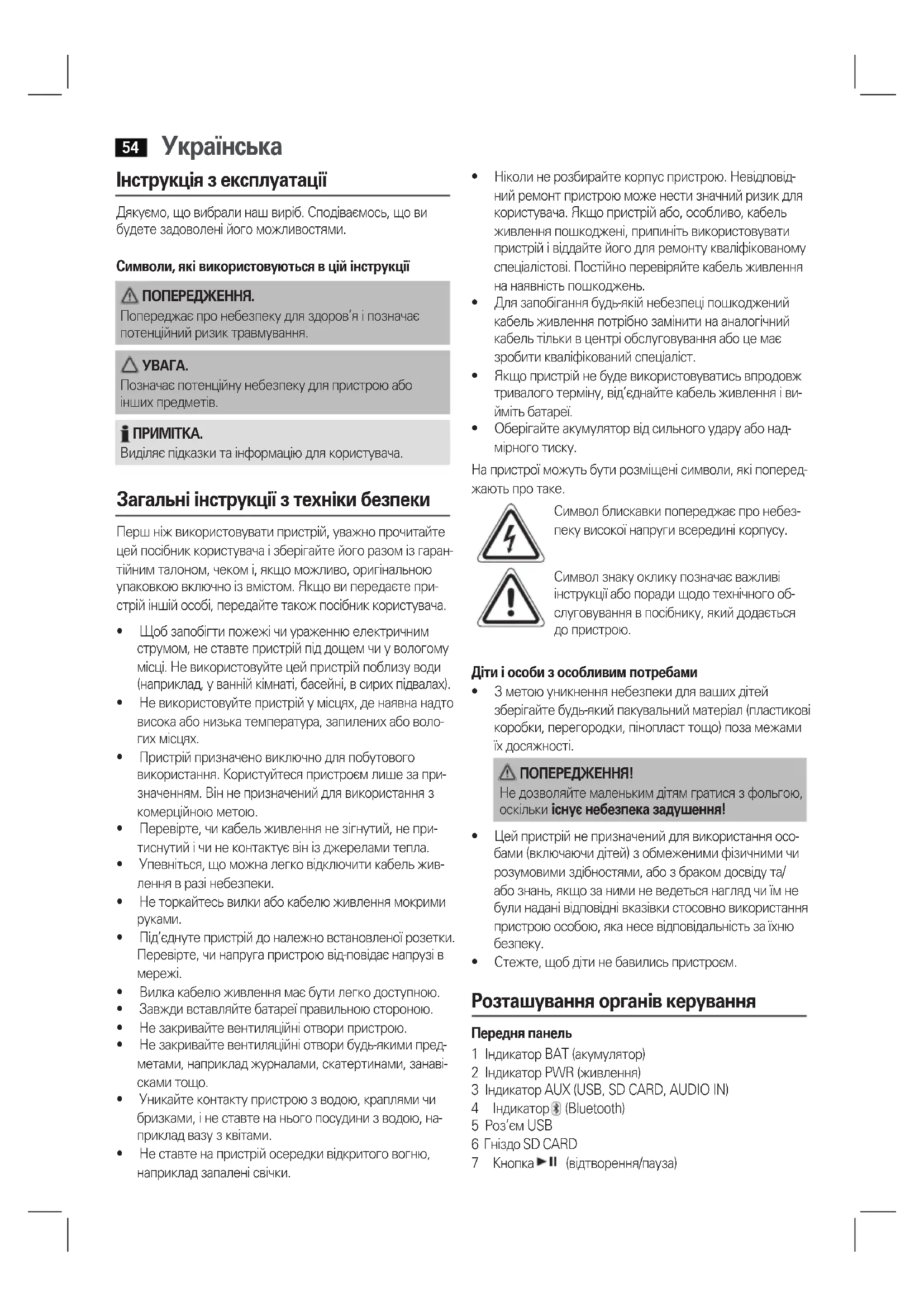 - Стежте,щобдітинебавилисьпристроєм. Розташування органів керування Передня панель 1 Індикатор BAT (акумулятор) 2 Індикатор PWR (живлення) 3 Індикатор AUX (USB, SD CARD, AUDIO IN) 4 Індикатор (Bluetooth) 5 Роз’єм USB 6 Гніздо SD CARD 7 Кнопка (відтворення/пауза)Українська