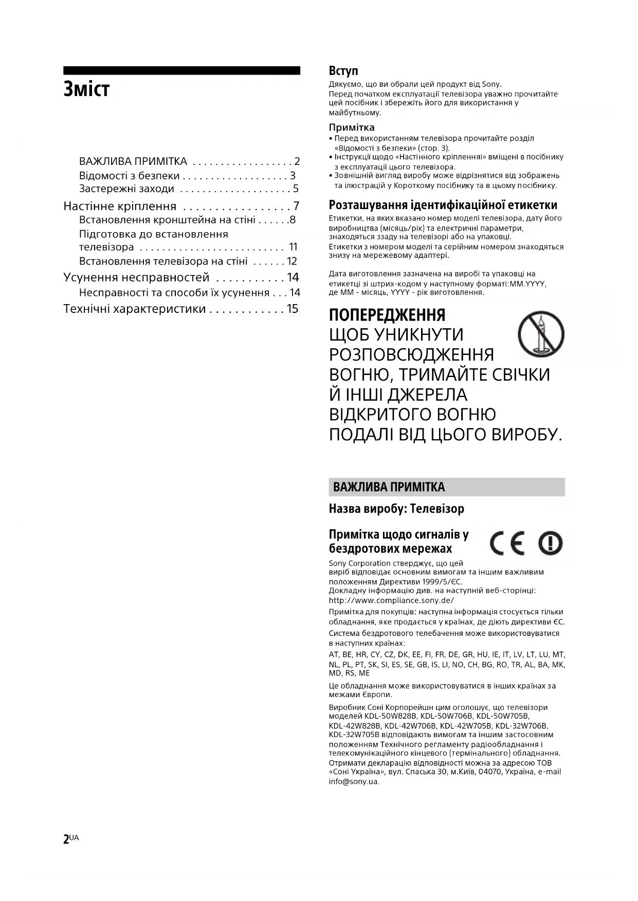 - Зовнішній вигляд виробу може відрізнятися від зображень та ілюстрацій у Короткому посібнику та в цьому посібнику. Розташування ідентифікаційної етикетки Етикетки, на яких вказано номер моделі телевізора, дату його виробництва (місяць/рік) та електричні параметри, знаходяться ззаду на телевізорі або на упаковці. Етикетки з номером моделі та серійним номером знаходяться знизу на мережевому адаптері.Дата виготовлення зазначена на виробі та упаковці на етикетці зі штрих-кодом у наступному форматі:MM.YYYY, де MM - місяць, YYYY - рік виготовлення. ПОПЕРЕДЖЕННЯ ЩОБ УНИКНУТИ РОЗПОВСЮДЖЕННЯ ВОГНЮ, ТРИМАЙТЕ СВІЧКИ Й ІНШІ ДЖЕРЕЛА ВІДКРИТОГО ВОГНЮ ПОДАЛІ ВІД ЦЬОГО ВИРОБУ. Назва виробу: Телевізор Примітка щодо сигналів у бездротових мережах Sony Corporation стверджує, що цей виріб відповідає основним вимогам та іншим важливим положенням Директиви 1999/5/ЄС.Докладну інформацію див. на наступній веб-сторінці:http://www.compliance.sony.de/ Примітка для покупців: наступна інформація стосується тільки обладнання, яке продається у країнах, де діють директиви ЄС. Система бездротового телебачення може використовуватися в наступних країнах:AT, BE, HR, CY, CZ, DK, EE, FI, FR, DE, GR, HU, IE, IT, LV, LT, LU, MT, NL, PL, PT, SK, SI, ES, SE, GB, IS, LI, NO, CH, BG, RO, TR, AL, BA, MK, MD, RS, ME Це обладнання може використовуватися в інших країнах за межами Європи.Виробник Соні Корпорейшн цим оголошує, що телевізори моделей KDL-50W828B, KDL-50W706B, KDL-50W705B, KDL-42W828B, KDL-42W706B, KDL-42W705B, KDL-32W706B, KDL-32W705B відповідають вимогам та іншим застосовним положенням Технічного регламенту радіообладнання і телекомунікаційного кінцевого (термінального) обладнання. Отримати декларацію відповідності можна за адресою ТОВ «Соні Україна», вул. Спаська 30, м.Київ, 04070, Україна, e-mail info@sony.ua. ВАЖЛИВА ПРИМІТКАUA
