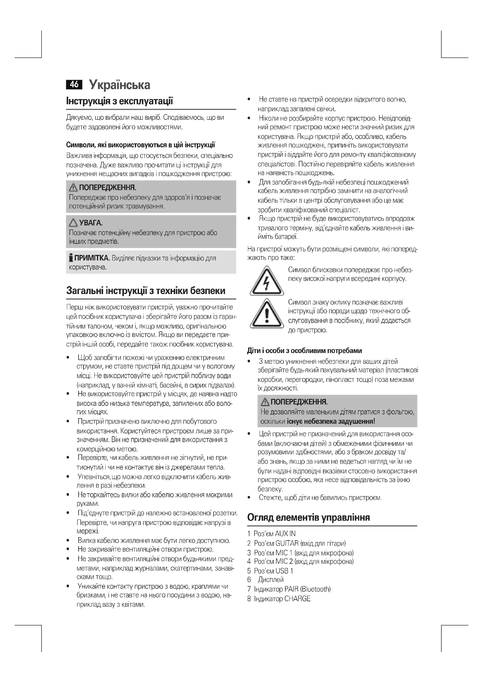 - Цей пристрій не призначений для використання особами (включаючи дітей) з обмеженими фізичними чи розумовими здібностями, або з браком досвіду та/або знань, якщо за ними не ведеться нагляд чи їм не були надані відповідні вказівки стосовно використання пристрою особою, яка несе відповідальність за їхню безпеку.