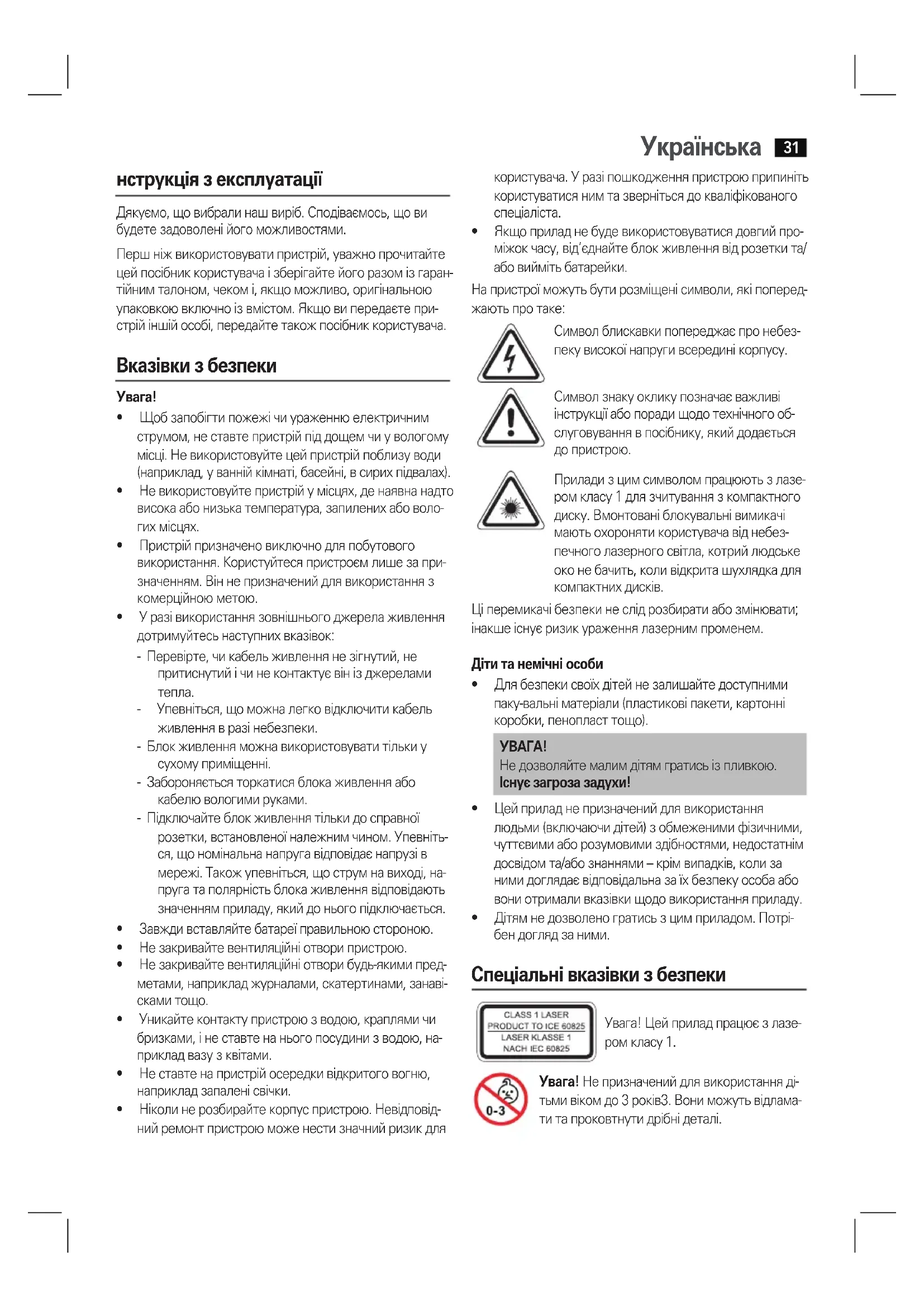 - Якщоприладнебудевикористовуватисядовгийпро- міжок часу, від’єднайте блок живлення від розетки та/ або вийміть батарейки. На пристрої можуть бути розміщені символи, які поперед- жають про таке: Символ блискавки попереджає про небез- пеку високої напруги всередині корпусу. Символ знаку оклику позначає важливі інструкції або поради щодо технічного об- слуговування в посібнику, який додається до пристрою. Прилади з цим символом працюють з лазе- ром класу 1 для зчитування з компактного диску. Вмонтовані блокувальні вимикачі мають охороняти користувача від небез- печного лазерного світла, котрий людське око не бачить, коли відкрита шухлядка для компактних дисків. Ці перемикачі безпеки не слід розбирати або змінювати; інакше існує ризик ураження лазерним променем. Діти та немічні особи