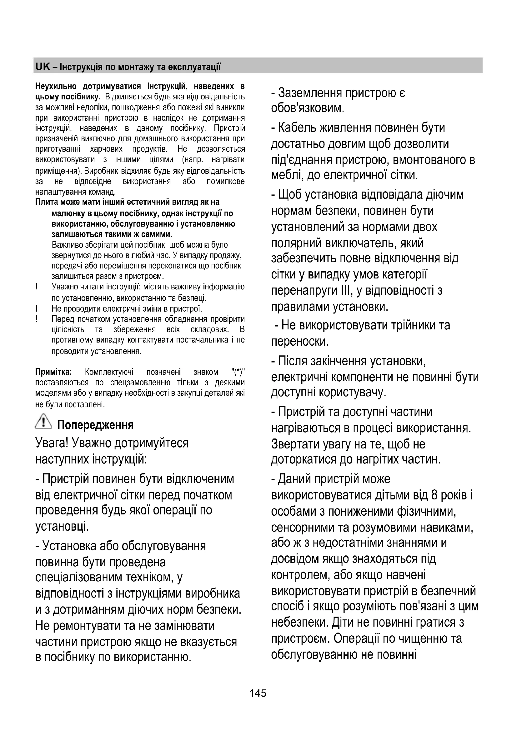 проблема была устранена. Если после вышеупомянутых проверок проблема не устранена, контактировать ближайшую Техническую службу помощи.145 UK – Інструкція по монтажу та експлуатації Неухильно дотримуватися інструкцій, наведених в цьому посібнику. Відхиляється будь яка відповідальність за можливі недоліки, пошкодження або пожежі які виникли при використанні пристрою в наслідок не дотримання інструкцій, наведених в даному посібнику. Пристрій призначеній виключно для домашнього використання при приготуванні харчових продуктів. Не дозволяється використовувати з іншими цілями (напр. нагрівати приміщення). Виробник відхиляє будь яку відповідальність за не відповідне використання або помилкове налаштування команд. Плита може мати інший естетичний вигляд як на малюнку в цьому посібнику, однак інструкції по використанню, обслуговуванню і установленню залишаються такими ж самими. Важливо зберігати цей посібник, щоб можна було звернутися до нього в любий час. У випадку