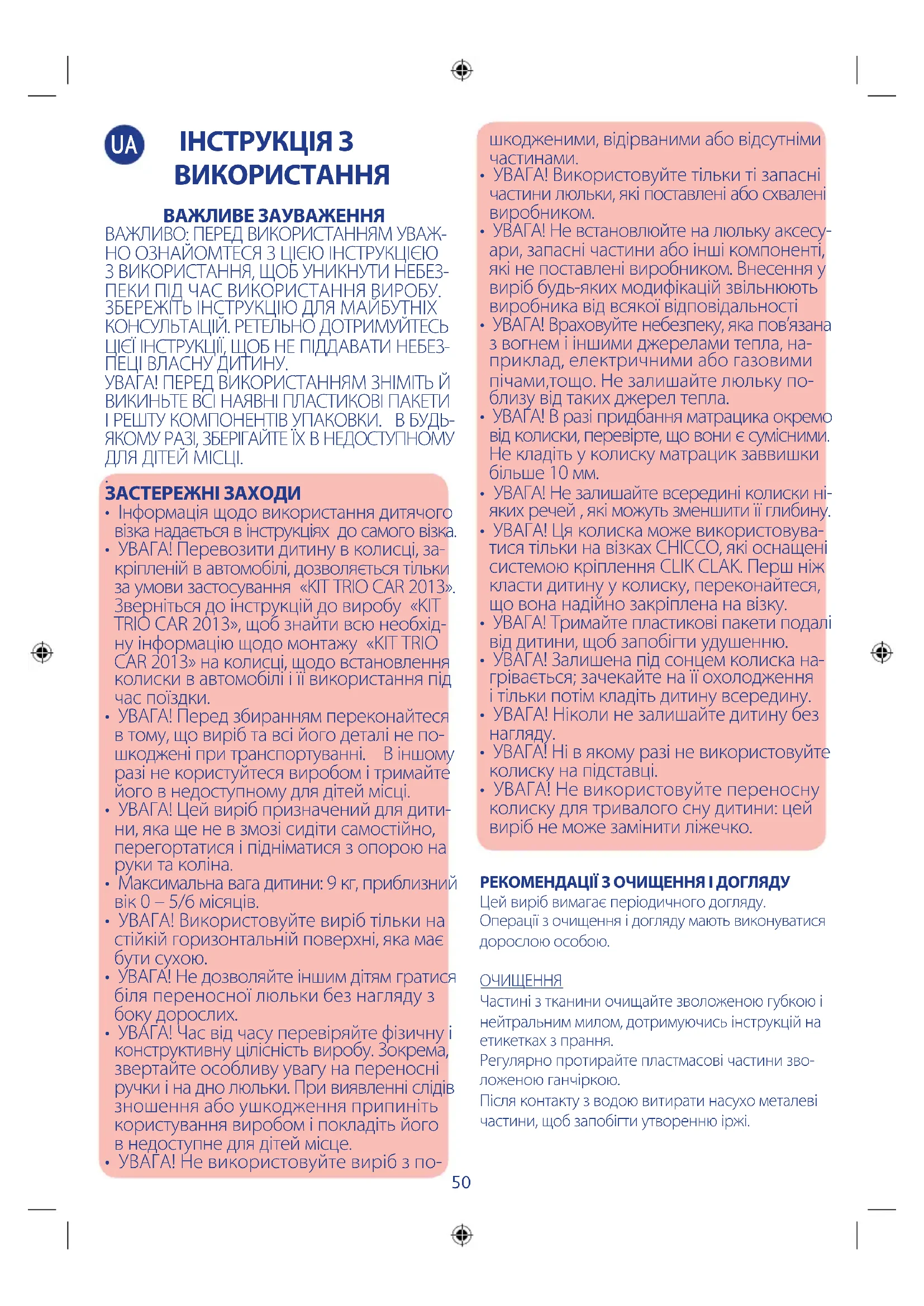 - УВАГА! Перевозити дитину в колисці, за- кріпленій в автомобілі, дозволяється тільки за умови застосування «KIT TRIO CAR 2013». Зверніться до інструкцій до виробу «KIT TRIO CAR 2013», щоб знайти всю необхід- ну інформацію щодо монтажу «KIT TRIO CAR 2013» на колисці, щодо встановлення колиски в автомобілі і її використання під час поїздки.