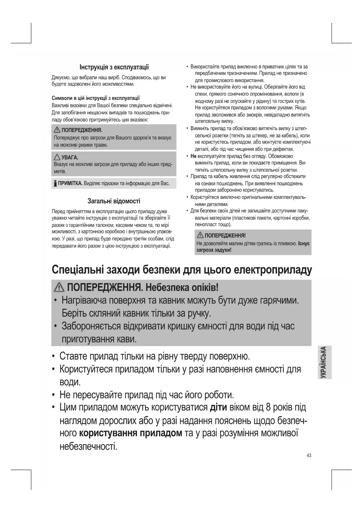ПРИМІТКА. Виділяє підказки та інформацію для Вас. Загальні відомості Перед прийняттям в експлуатацію цього приладу дуже уважно читайте інструкцію з експлуатації та зберігайте її разом з гарантійним талоном, касовим чеком та, по мірі можливості, з картонною коробкою і внутрішньою упаков- кою. У разі, що прилад буде передано третім особам, слід передавати його разом з цією інструкцією з експлуатації. Спеціальні заходи безпеки для цього електроприладу ПОПЕРЕДЖЕННЯ. Небезпека опіків!