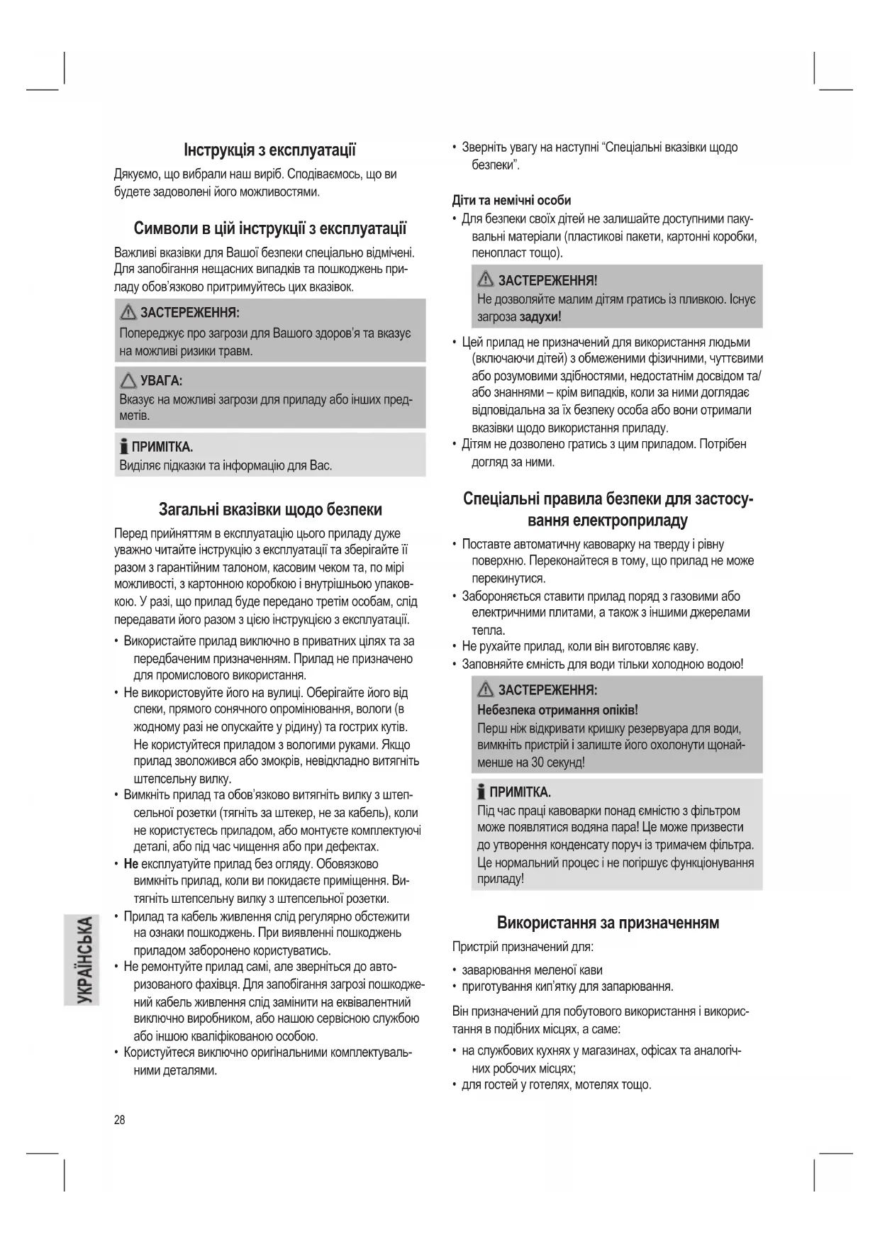 - для гостей у готелях, мотелях тощо. Інструкція з експлуатації Дякуємо, що вибрали наш виріб. Сподіваємось, що ви будете задоволені його можливостями. Символи в цій інструкції з експлуатації Важливі вказівки для Вашої безпеки спеціально відмічені. Для запобігання нещасних випадків та пошкоджень при- ладу обов’язково притримуйтесь цих вказівок. ЗАСТЕРЕЖЕННЯ: Попереджує про загрози для Вашого здоров’я та вказує на можливі ризики травм.