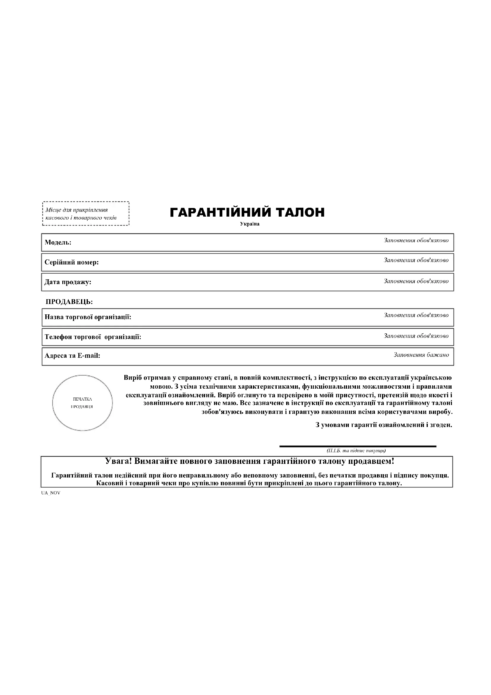 Увага! Вимагайте повного заповнення гарантійного талону продавцем! Гарантійний талон недійсний при його неправильному або неповному заповненні, без печатки продавця і підпису покупця. Касовий і товарний чеки про купівлю повинні бути прикріплені до цього гарантійного талону. Виріб отримав у справному стані, в повній комплектності, з інструкцією по експлуатації українською мовою. З усіма технічними характеристиками, функціональними можливостями і правилами експлуатації ознайомлений. Виріб оглянуто та перевірено в моїй присутності, претензій щодо якості і зовнішнього вигляду не маю. Все зазначене в інструкції по експлуатації та гарантійному талоні зобов'язуюсь виконувати і гарантую виконання всіма користувачами виробу. З умовами гарантії ознайомлений і згоден. ПЕЧАТКА ПРОДАВЦЯ Серійний номер: Дата продажу: