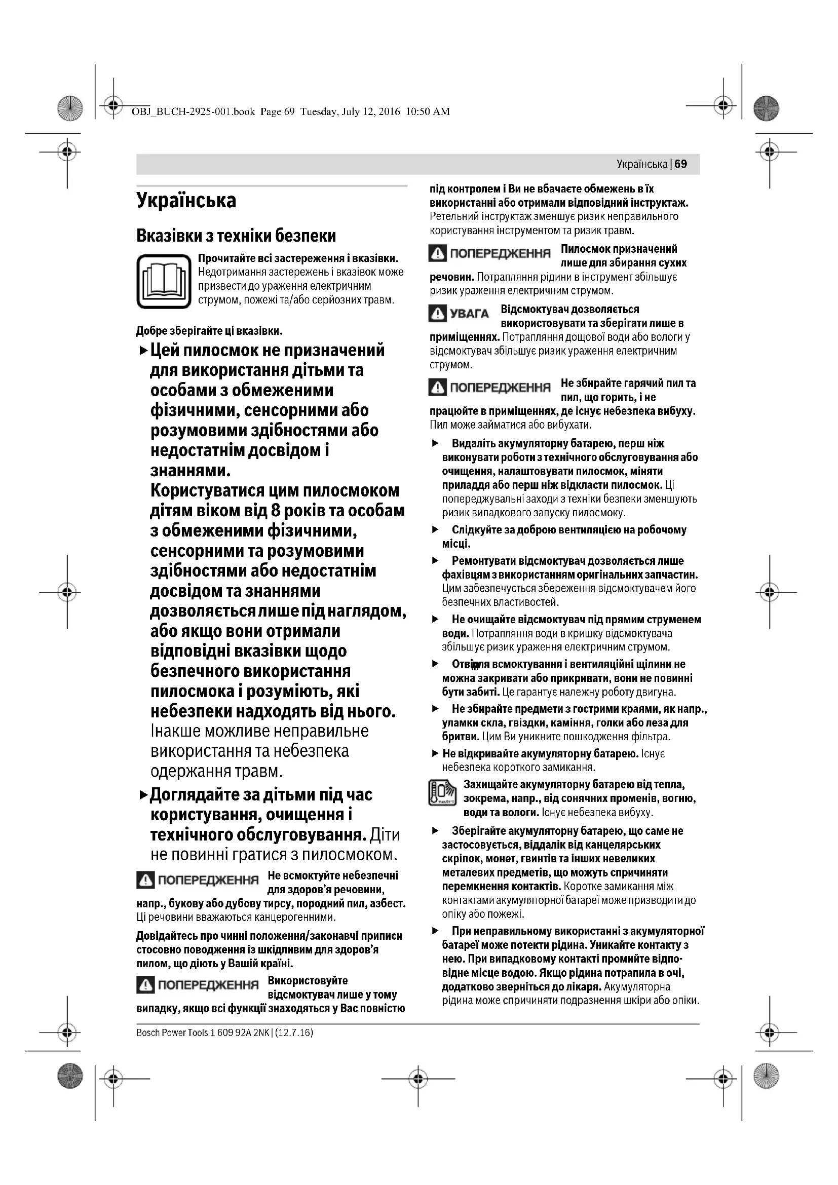 для всмоктування і вентиляційні щілини не можна закривати або прикривати, вони не повинні бути забиті. Це гарантує належну роботу двигуна. Не збирайте предмети з гострими краями, як напр., уламки скла, гвіздки, каміння, голки або леза для бритви. Цим Ви уникните пошкодження фільтра. Не відкривайте акумуляторну батарею. Існує небезпека короткого замикання. Захищайте акумуляторну батарею від тепла, зокрема, напр., від сонячних променів, вогню, води та вологи. Існує небезпека вибуху. Зберігайте акумуляторну батарею, що саме не застосовується, віддалік від канцелярських скріпок, монет, гвинтів та інших невеликих металевих предметів, що можуть спричиняти перемкнення контактів. Коротке замикання між контактами акумуляторної батареї може призводити до опіку або пожежі. При неправильному використанні з акумуляторної батареї може потекти рідина. Уникайте контакту з нею. При випадковому контакті промийте відпо- відне місце водою. Якщо рідина потрапила в очі, додатково зверніться до лікаря. Акумуляторна рідина може спричиняти подразнення шкіри або опіки. OBJ_BUCH-2925-001.book Page 69 Tuesday, July 12, 2016 10:50 AM70 | Українська 1 609 92A 2NK | (12.7.16) Bosch Power Tools При пошкодженні або неправильній експлуатації акумуляторної батареї може виходити пар. Впустіть свіже повітря і – у разі скарг – зверніться до лікаря. Пар може подразнювати дихальні шляхи. Заряджайте акумуляторні батареї лише в заряджувальних пристроях, рекомендованих виготовлювачем. Використання заряджувального пристрою для акумуляторних батарей, для яких він не передбачений, може призводити до пожежі. Використовуйте акумуляторну батарею лише з Вашим інструментом Bosch. Лише за таких умов акумуляторна батарея буде захищена від небезпечного перевантаження. Гострими предметами, напр., гвіздками або викрутками, або прикладанням зовнішньої сили можна пошкодити акумуляторну батарею. Можливе внутрішнє коротке замикання, загоряння, утворення диму, вибух або перегрів акумуляторної батареї. Опис продукту і послуг Призначення приладу Пилосмок призначений для збирання та всмоктування не шкідливих для здоров'я сухих речовин. Користуйтеся пилосмоком, лише якщо Ви отримали достатньо інформації стосовно користування ним. Ретельний інструктаж зменшує ризик неправильного користування інструментом та ризик травм. Зображені компоненти Нумерація зображених компонентів посилається на зображення відсмоктувача на сторінці з малюнком. 1 Кнопка розблокування пилової камери 2 Вимикач 3 Індикатор зарядженості акумуляторної батареї 4 Рукоятка 5 Акумуляторна батарея* 6 Вентиляційні щілини 7 Корпус мотора 8 Пилова камера 9 Щілинна насадка 10 Отвір для всмоктування 11 Секція для акумуляторної батареї 12 Кнопка розблокування акумуляторної батареї 13 Проріз 14 Ущільнення фільтра 15 Фільтр *Зображене або описане приладдя не входить в стандартний обсяг поставки. Повний асортимент приладдя Ви знайдете в нашій програмі приладдя. Технічні дані