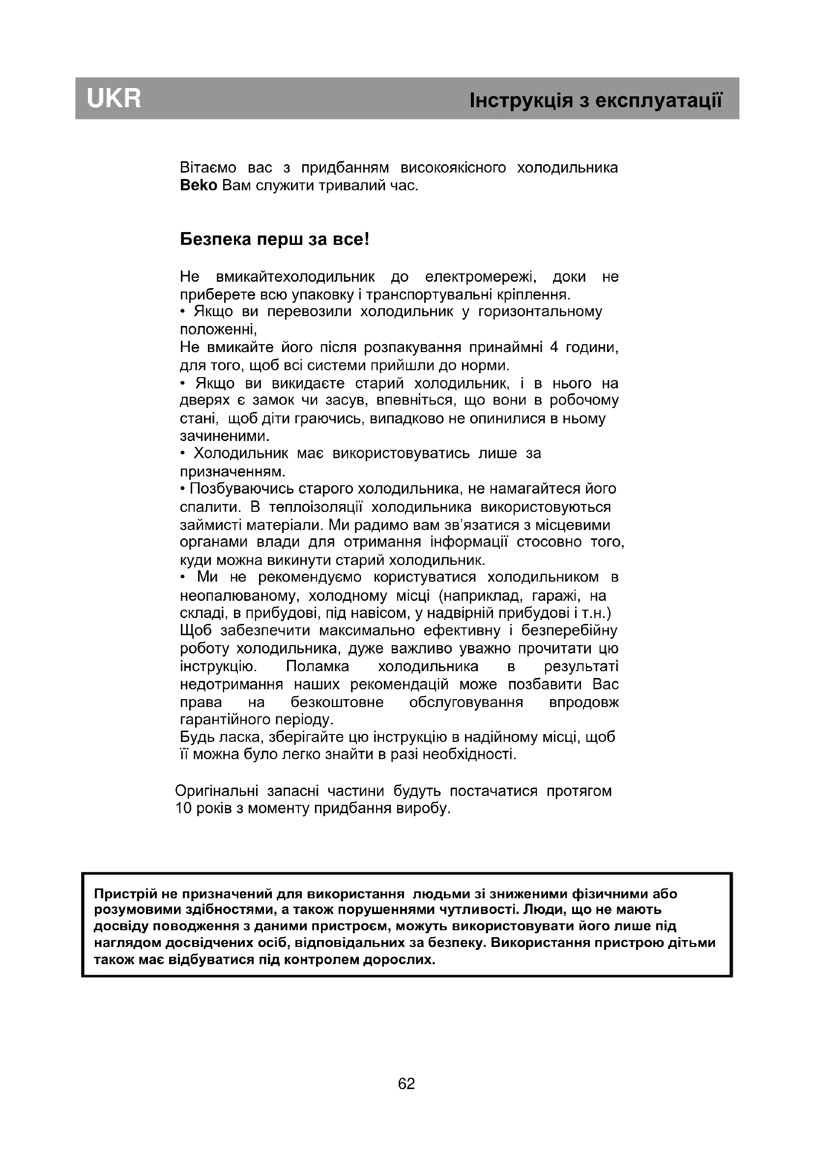 - Ми не рекомендуємо користуватися холодильником в неопалюваному, холодному місці (наприклад, гаражі, на складі, в прибудові, під навісом, у надвірній прибудові і т.н.) Щоб забезпечити максимально ефективну і безперебійну роботу холодильника, дуже важливо уважно прочитати цю інструкцію. Поламка холодильника в результаті недотримання наших рекомендацій може позбавити Вас права на безкоштовне обслуговування впродовж гарантійного періоду. Будь ласка, зберігайте цю інструкцію в надійному місці, щоб її можна було легко знайти в разі необхідності. Оригінальні запасні частини будуть постачатися протягом 10 років з моменту придбання виробу.
