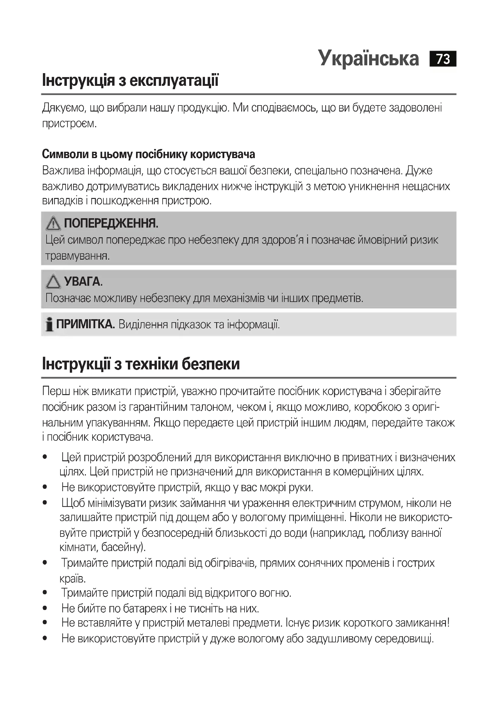 Позначає можливу небезпеку для механізмів чи інших предметів. ПРИМІТКА. Виділення підказок та інформації. Інструкції з техніки безпеки Перш ніж вмикати пристрій, уважно прочитайте посібник користувача і зберігайте посібник разом із гарантійним талоном, чеком і, якщо можливо, коробкою з оригі- нальним упакуванням. Якщо передаєте цей пристрій іншим людям, передайте також і посібник користувача.