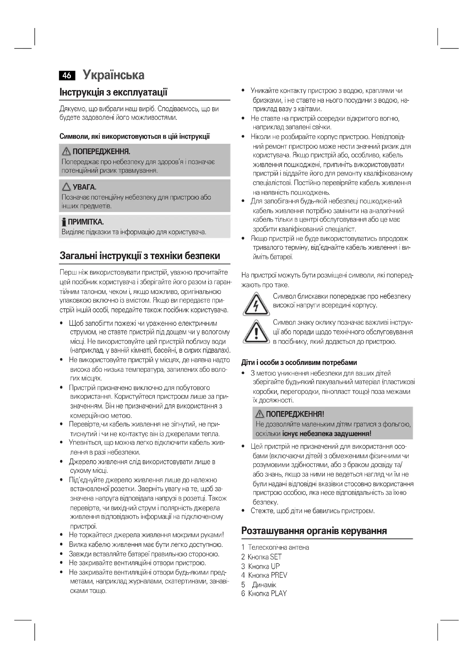 - Стежте,щобдітинебавилисьпристроєм. Розташування органів керування 1 Телескопічна антена 2 Кнопка SET 3 Кнопка UP 4 Кнопка PREV 5 Динамік 6 Кнопка PLAYУкраїнська