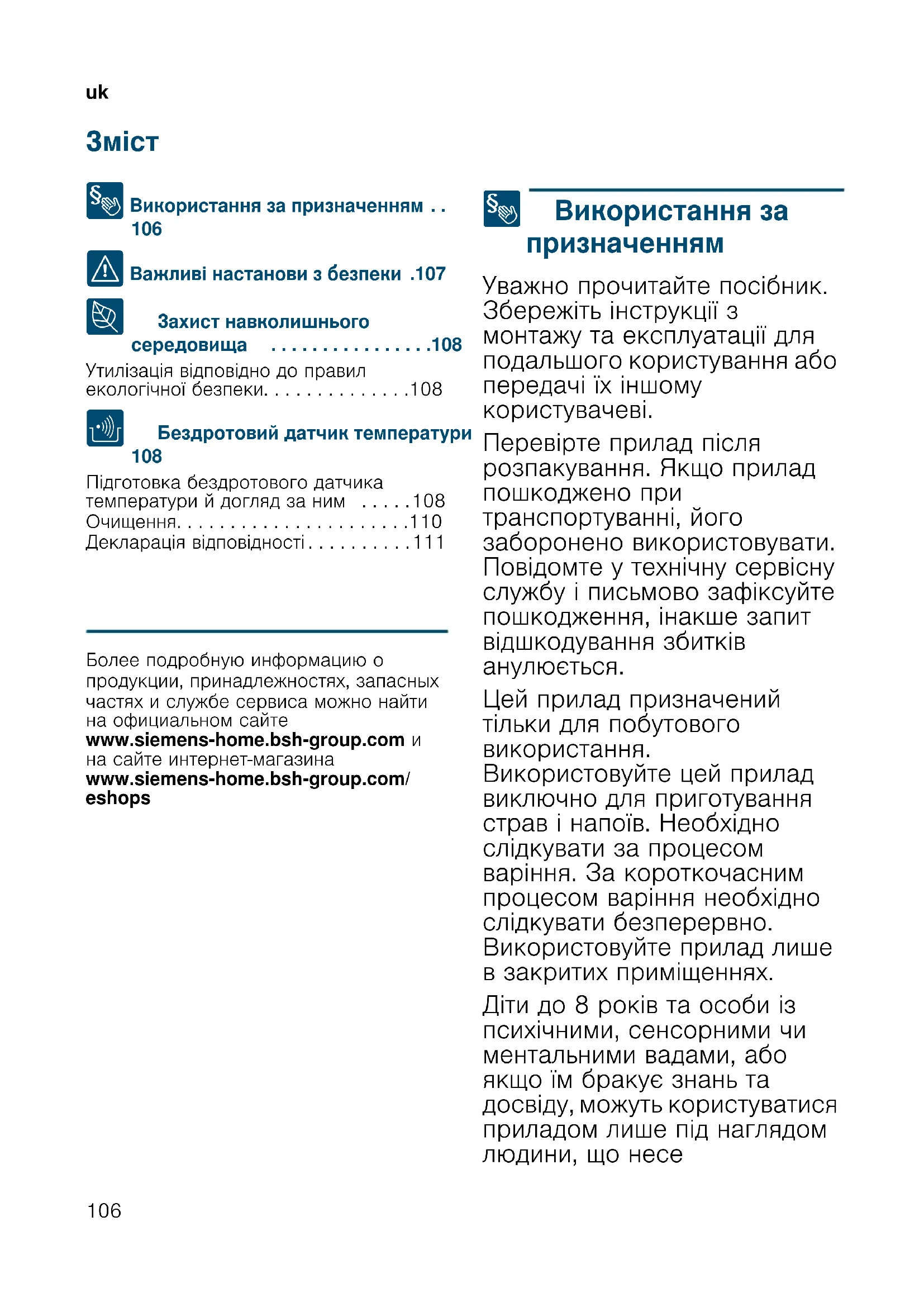 Підготовка бездротового датчика температури й догляд за ним . . . . .108 Очищення. . . . . . . . . . . . . . . . . . . . . .110 Декларація відповідності . . . . . . . . . .111 Produktinfo Более подробную информацию о продукции, принадлежностях, запасных частях и службе сервиса можно найти на официальном сайте www.siemens-home.bsh-group.com и на сайте интернет-магазина www.siemens-home.bsh-group.com/ eshops 8 Використання за призначенням Використання за призначенням Уважно прочитайте посібник. Збережіть інструкції з монтажу та експлуатації для подальшого користування або передачі їх іншому користувачеві. Перевірте прилад після розпакування. Якщо прилад пошкоджено при транспортуванні, його заборонено використовувати. Повідомте у технічну сервісну службу і письмово зафіксуйте пошкодження, інакше запит відшкодування збитків анулюється. Цей прилад призначений тільки для побутового використання. Використовуйте цей прилад виключно для приготування страв і напоїв. Необхідно слідкувати за процесом варіння. За короткочасним процесом варіння необхідно слідкувати безперервно. Використовуйте прилад лише в закритих приміщеннях. Діти до 8 років та особи із психічними, сенсорними чи ментальними вадами, або якщо їм бракує знань та досвіду, можуть користуватися приладом лише під наглядом людини, що несеuk