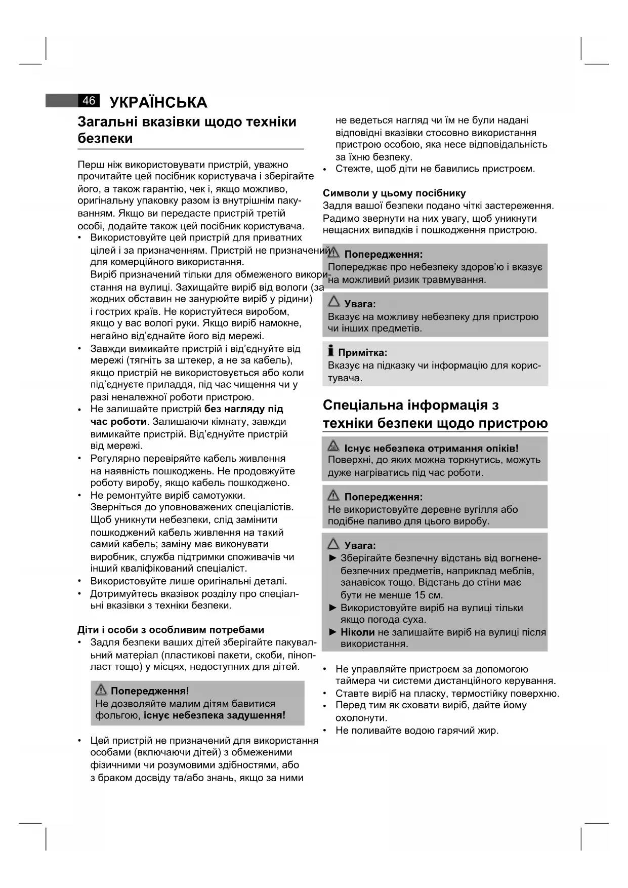 Спеціальна інформація з техніки безпеки щодо пристрою Існує небезпека отримання опіків! Поверхні, до яких можна торкнутись, можуть дуже нагріватись під час роботи. Попередження: Не використовуйте деревне вугілля або подібне паливо для цього виробу.